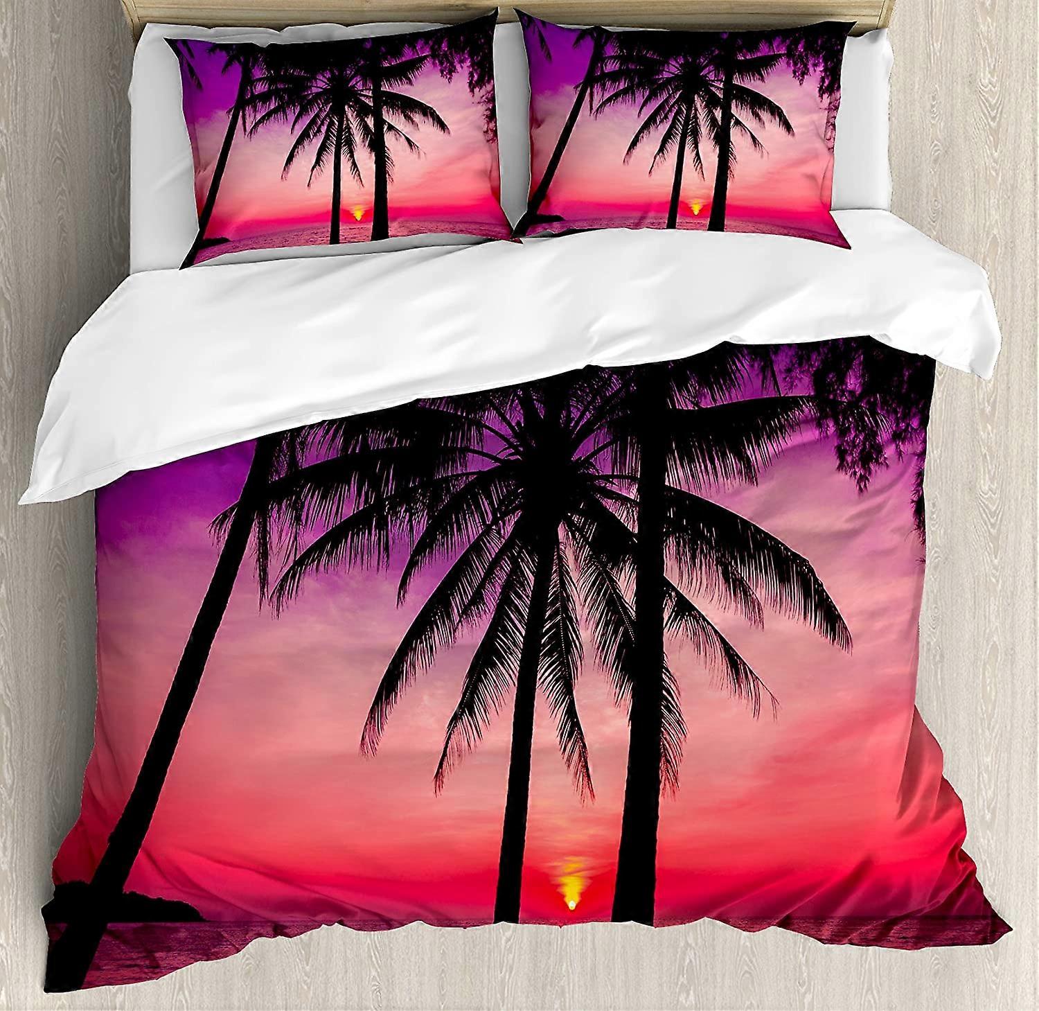 Tropical Duvet Cover Set, Palm Trees Silhouette Sunset Coastline, 3-Piece Bedding with 2 Pillowcases, Magenta Purple