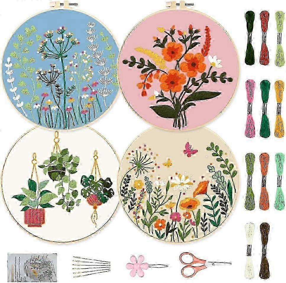 z 4 Pack Flowers & Plants Embroidery Kits for Beginners, DIY Hand Stitching Craft with Patterns, Instructions – Compatible with Adult Wo