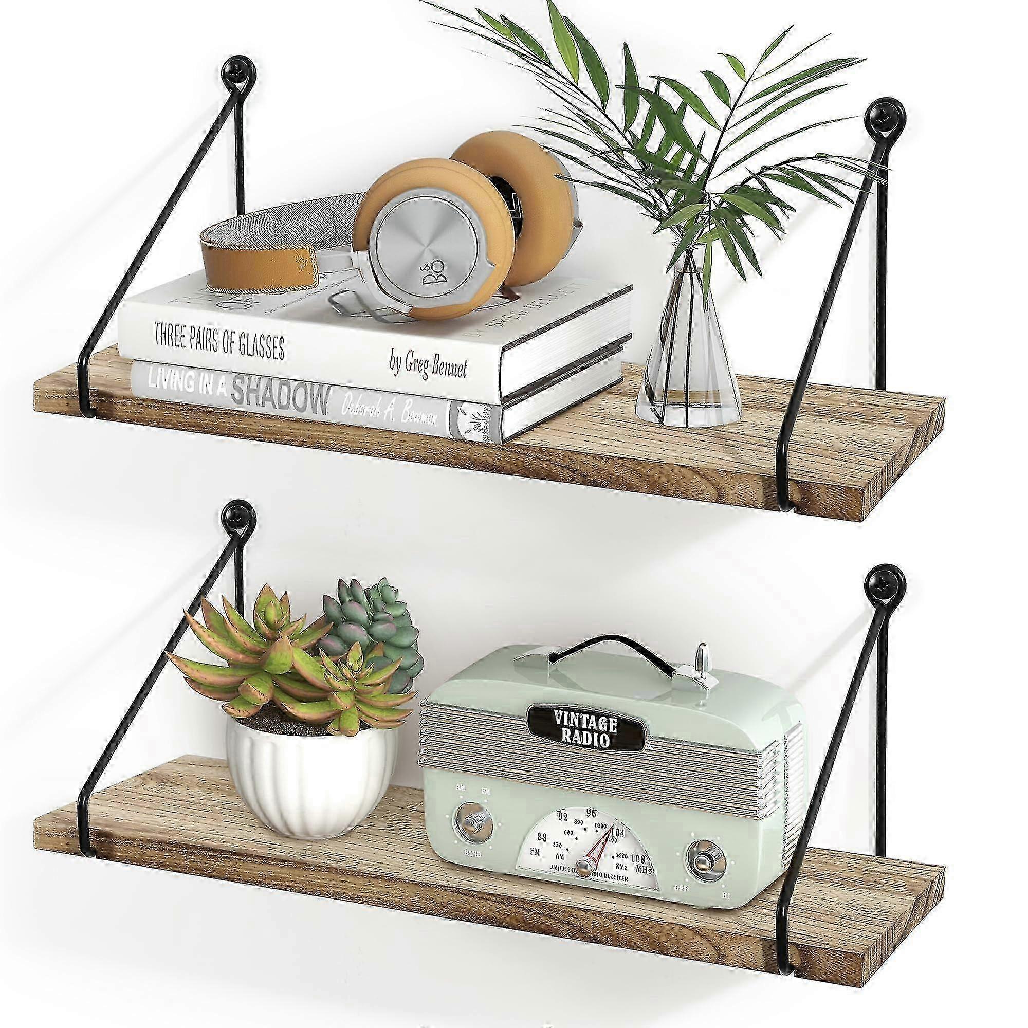 z Set of 2 Rustic Floating Shelves - Wall-Mounted Storage with Metal Brackets