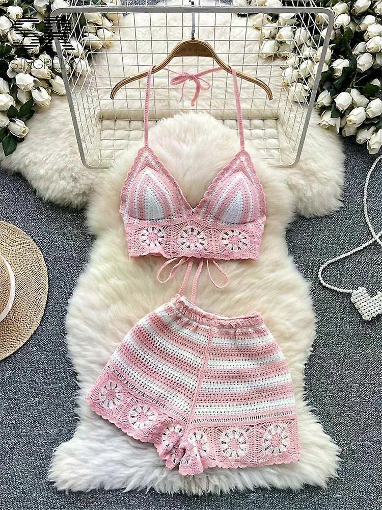 Beach Vacation Knit 2pcs Suits Women Halter Sleeveless Lace Up Camis+Elastic Waist Shorts Hook Flower Hollow 2pcs Set
