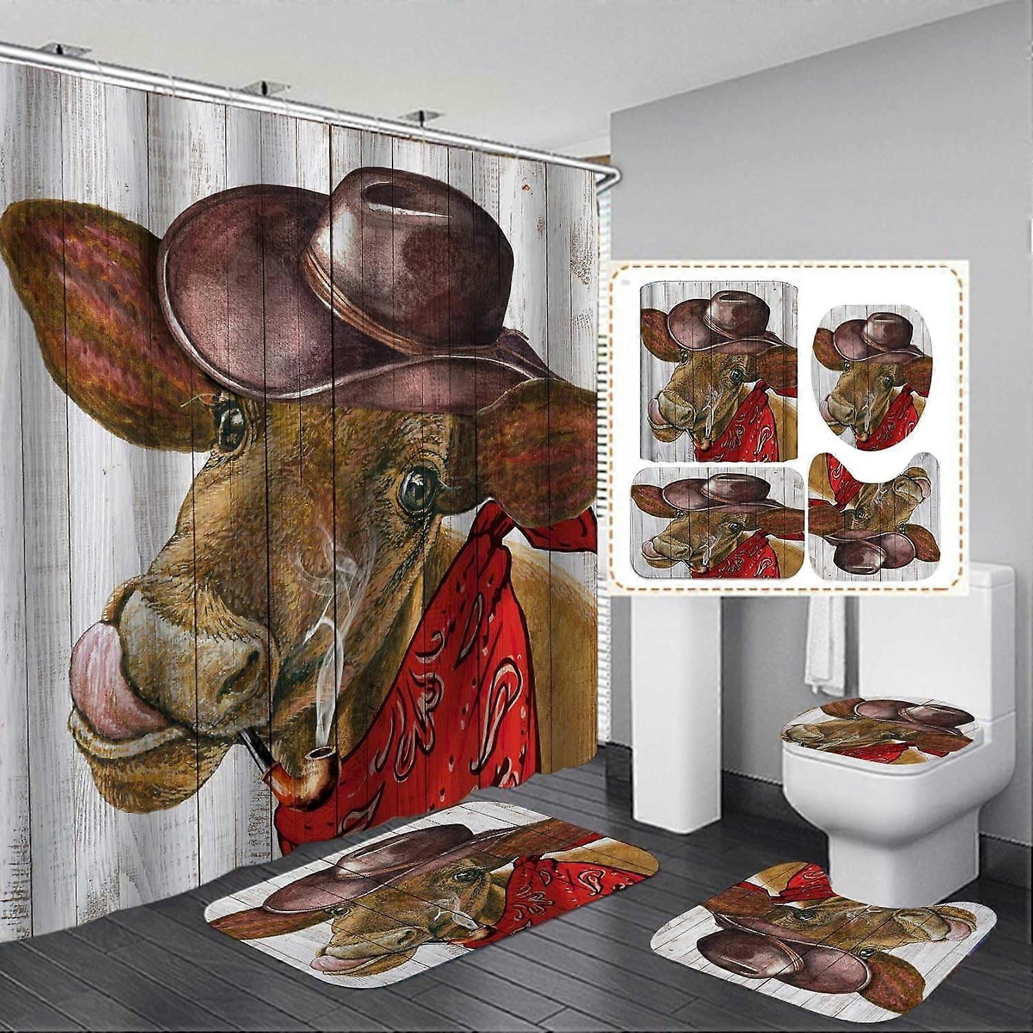 4PCS Set Funny Cow Rustic Wagon Wheel Shower Curtain, Farm Animals Bathroom Decor, Non-Slip Bath Rugs & Toilet Mat, Welcome to My Farm