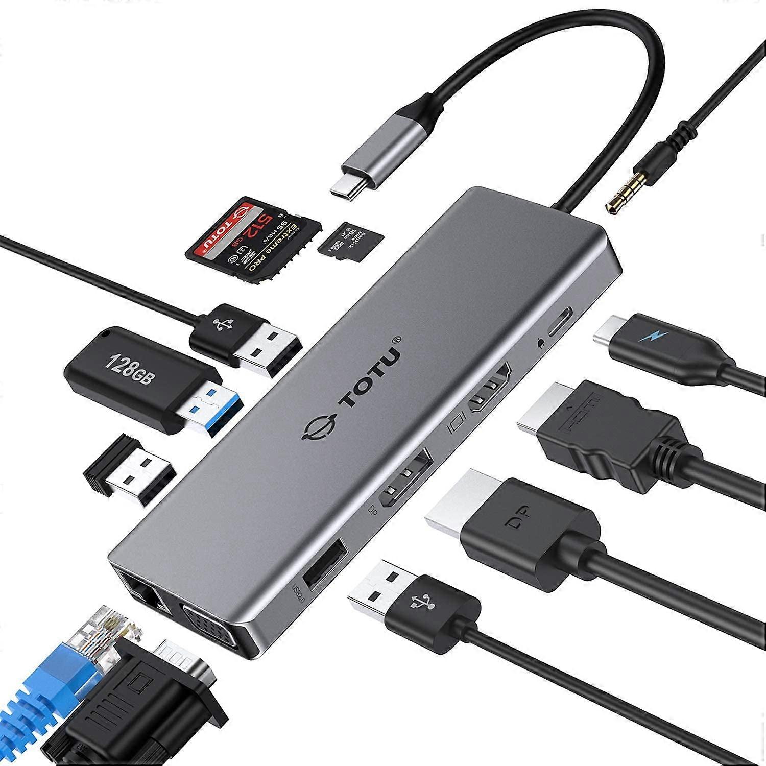 USB C Hub, TOTU 13 in 1 Type C Hub with 4K HDMI, DP, VGA, 2 USB3.0, 2 USB2.0, 75W PD, compatible with MacBook Pro & Windows, macOS mirror only