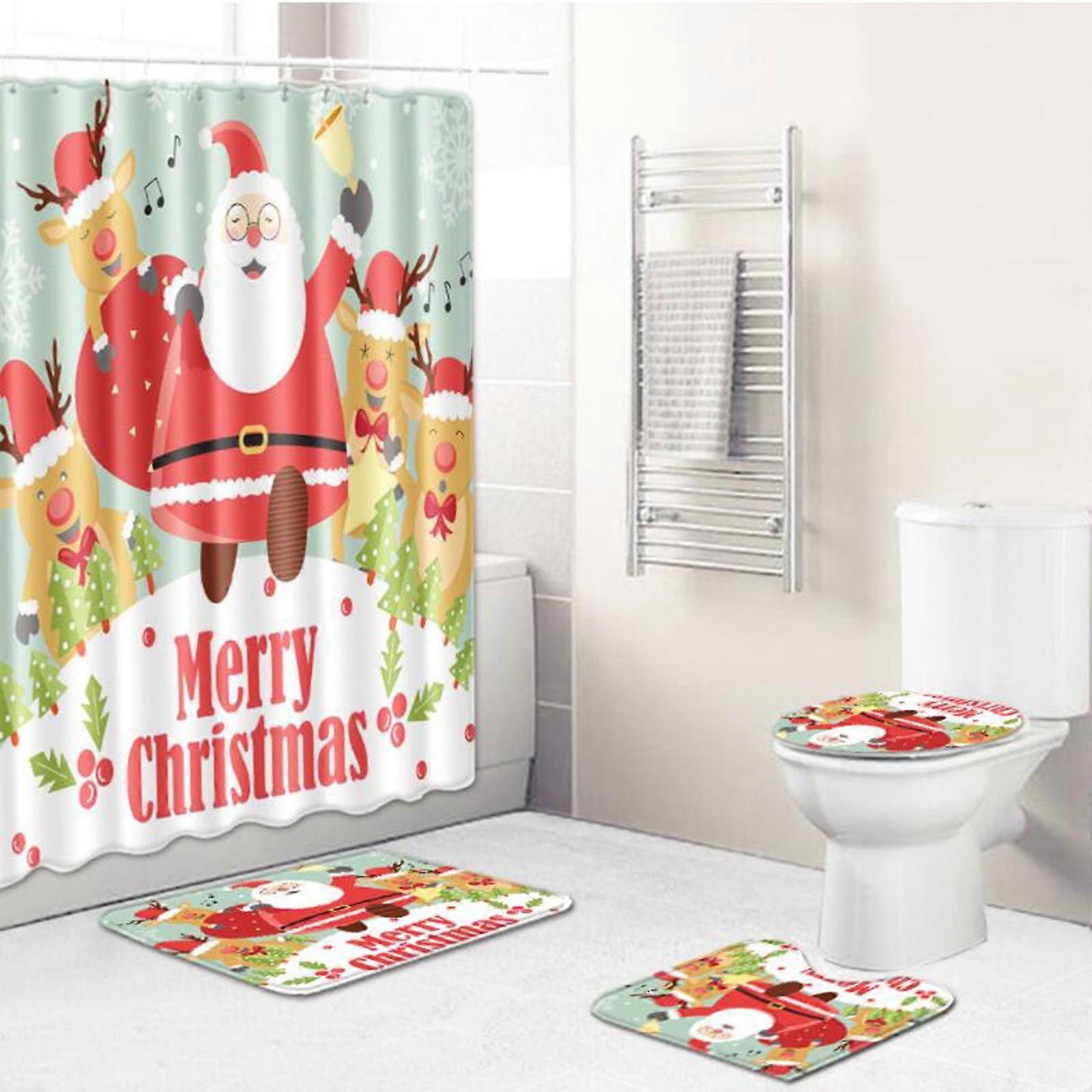 Giyblacko Shower Curtain 4PCS Combination Christmas Bathroom Floor Mat Toilet Mat Shower Curtain