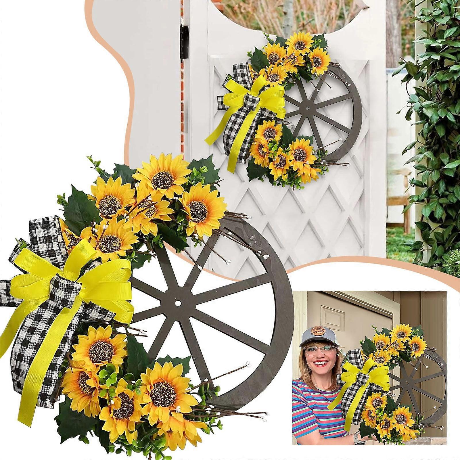 Sunflower Wreath for Summer - Farmhouse Wooden Wheel Door Hanging, Simulation Flower Wall Decor (1 Pc)