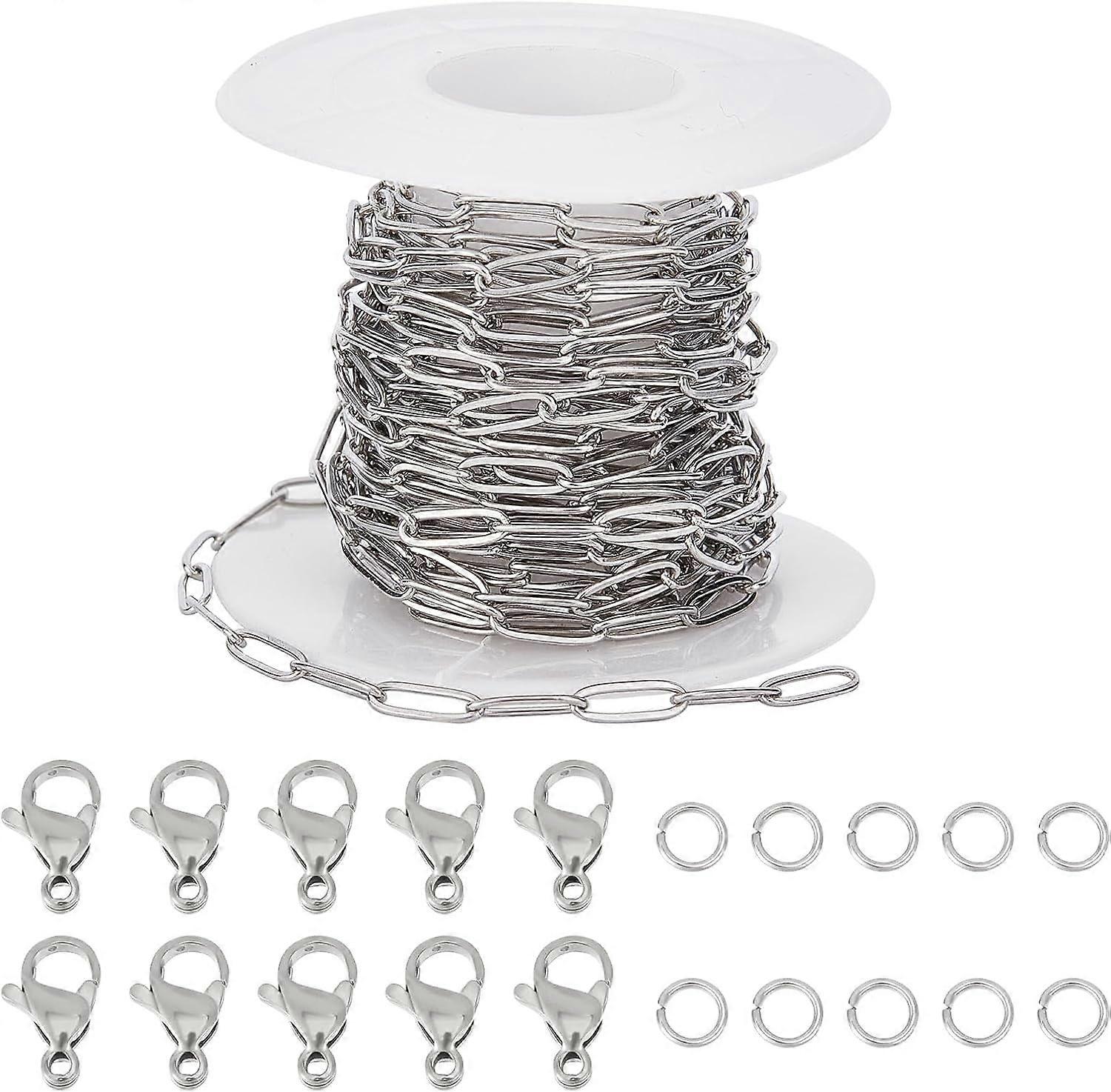 16.4Feet/ 5M Paper Clip Chain Spool Stainless Steel Silver Color Paperclip Chains Roll 30Pcs Open Jump Rings 10Pcs Lobster Claw Clasps
