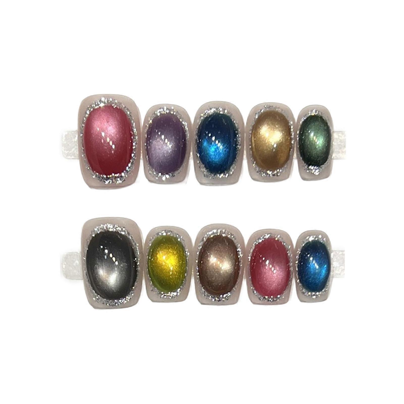 10PCS Fake Nails 3D Cat's Eye Press On Nails Colorful Glass Beads Design Fashion