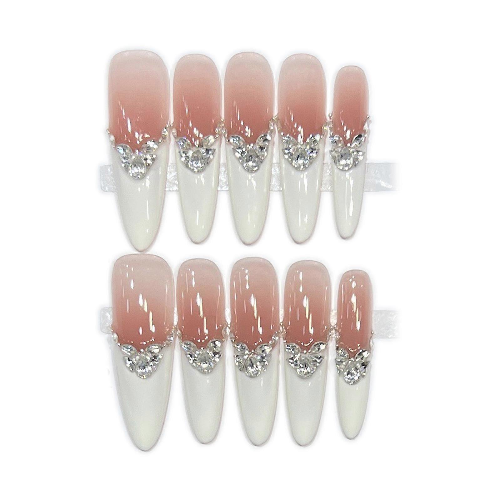 10Pcs White French Press On Nails With Zircon Stone Decorations Artificial