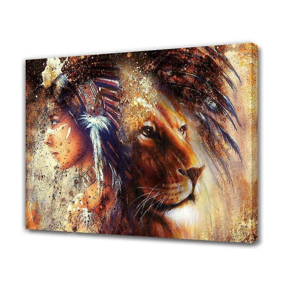 Native American Woman with Feather Headdress & Lion Canvas Poster, 12x18in - Frame-style Bedroom Office Decor Gift