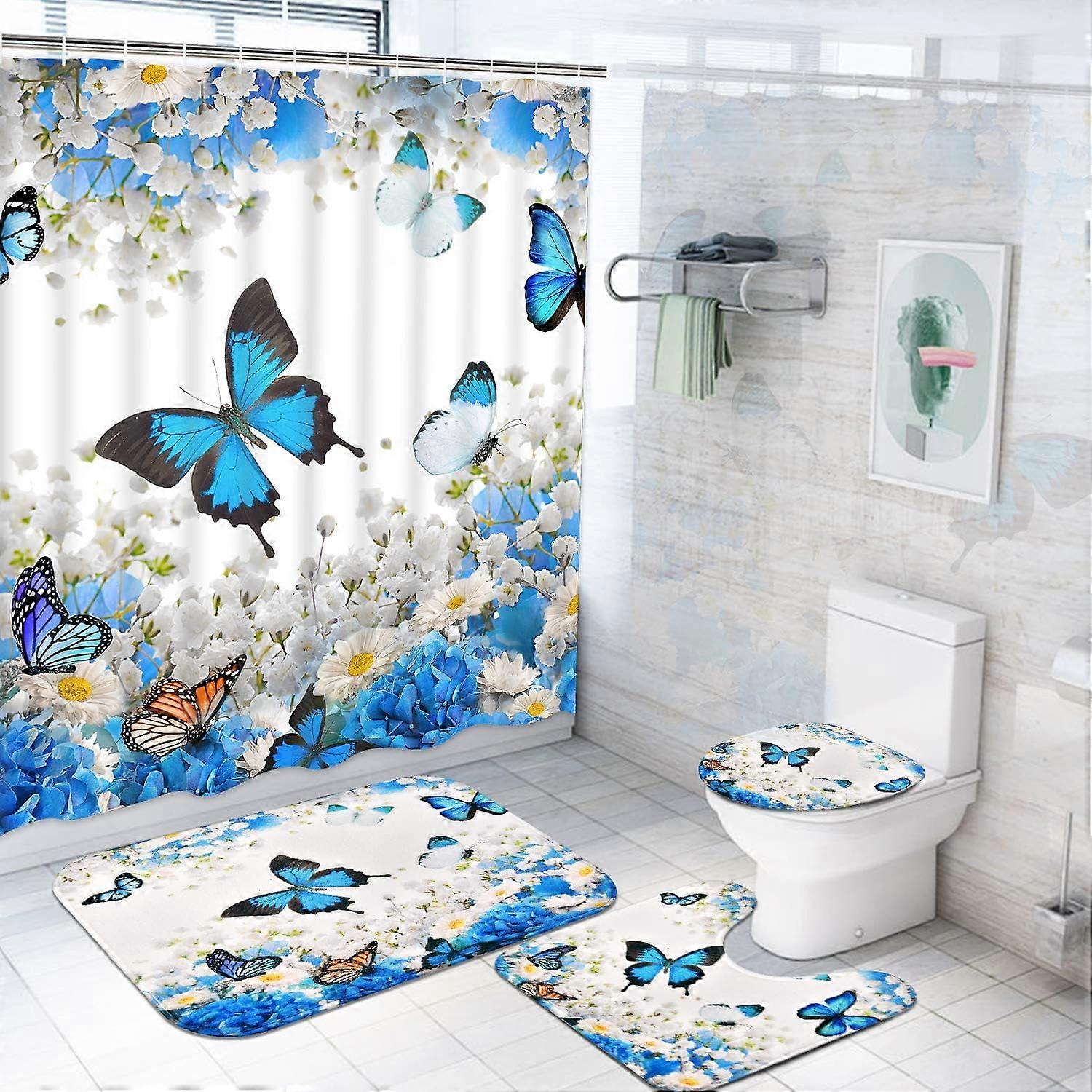 4 Pcs Pink Rose Shower Set with Rug, Toilet Cover & Bath Mat, Compatible with 12 Hooks, Waterproof