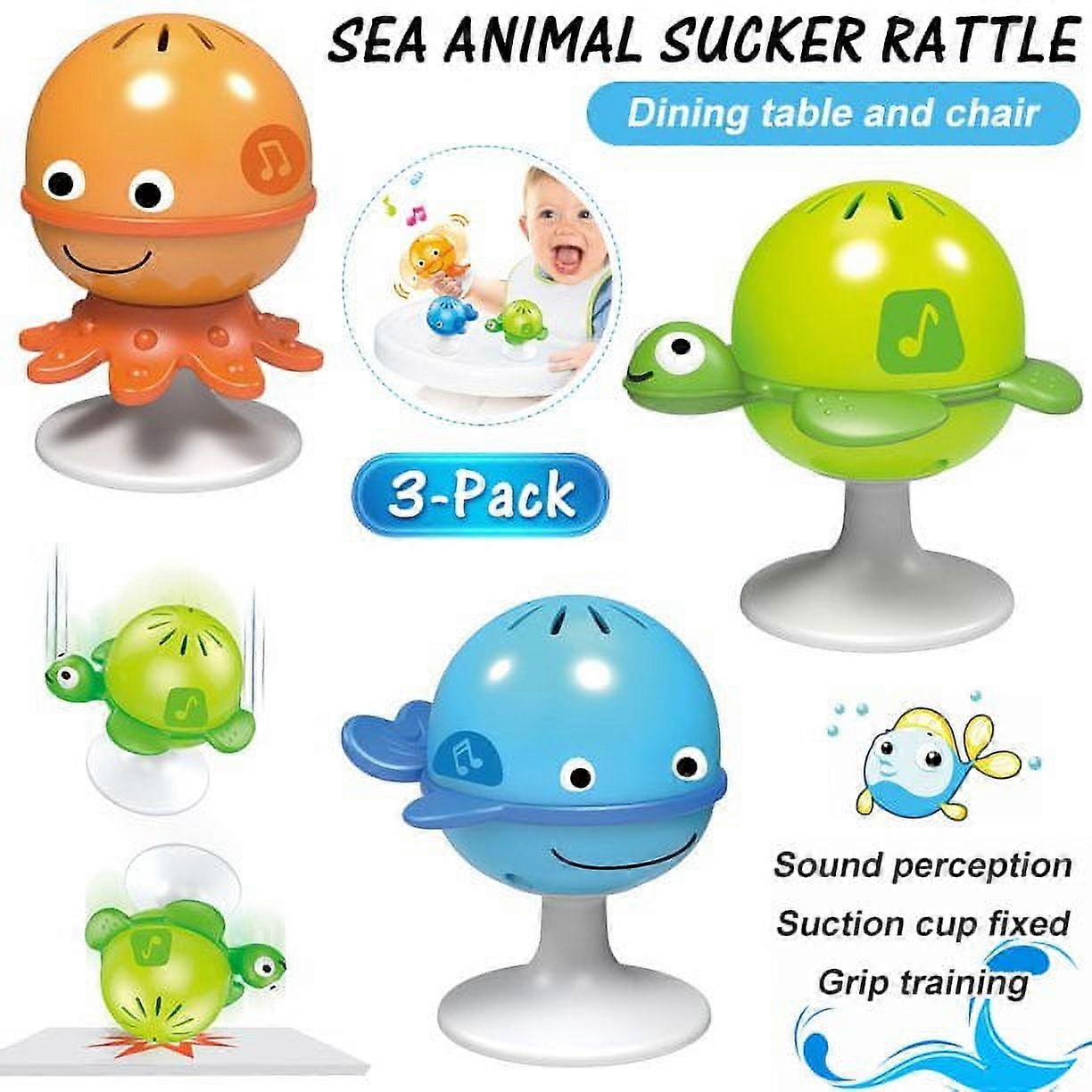 Main Feature: THREE FRIENDLY SEA CREATURES: The baby rattle set is made up of three cute and colorful sea creatures. Your baby will have tons of fun playing with the turtle, octopus and whale UNIQUE RATTLE SOUNDS: Each rattle emits a unique sound when shaken. This toy trio also introduces babies to the wonders of sound STURDY SUCTION CUPS: Each rattle has a sturdy suction cup that secures it to smooth surfaces preventing the toy from toppling over. Playtime is possible anywhere, anytime! PERFECT FOR SMALL HANDS: The colorful Put-Stay Rattle Set is expertly designed to fit snuggly into little hands. The toy is safe for your newborn bundle of joy SAFE TO PLAY WITH: Child-safe paint finish and sturdy wood construction make this a long-lasting toy your child will love for years to come. Designed for kids 0 months and up Specifications: Material:Plastic Size:6*6.5*8cm Color:Blue/Green/Yellow Style:Suction Cup Weight:0.61lb Package Include: 3*Shake & Rattle Toy Shake, rattle & won't-roll-away! Suction cup feet stick to flat surfaces like high chairs or restaurant tables. Transparent Backs let baby see what's making noise.