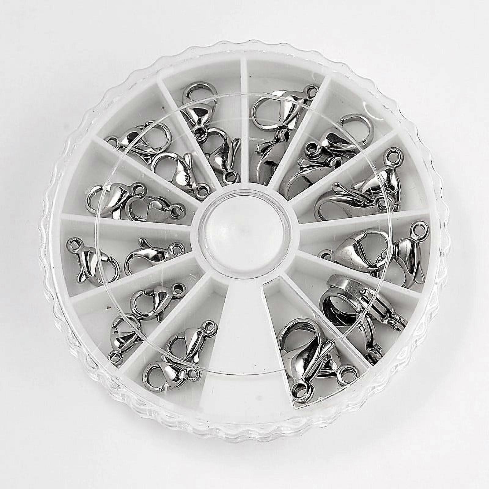 1Box 304 Stainless Steel Lobster Claw Clasps Mixed Size Stainless Steel Color 9~15x5~9x2.5~4mm Hole: 1~2mm 2pcs/compartments 24pcs/box
