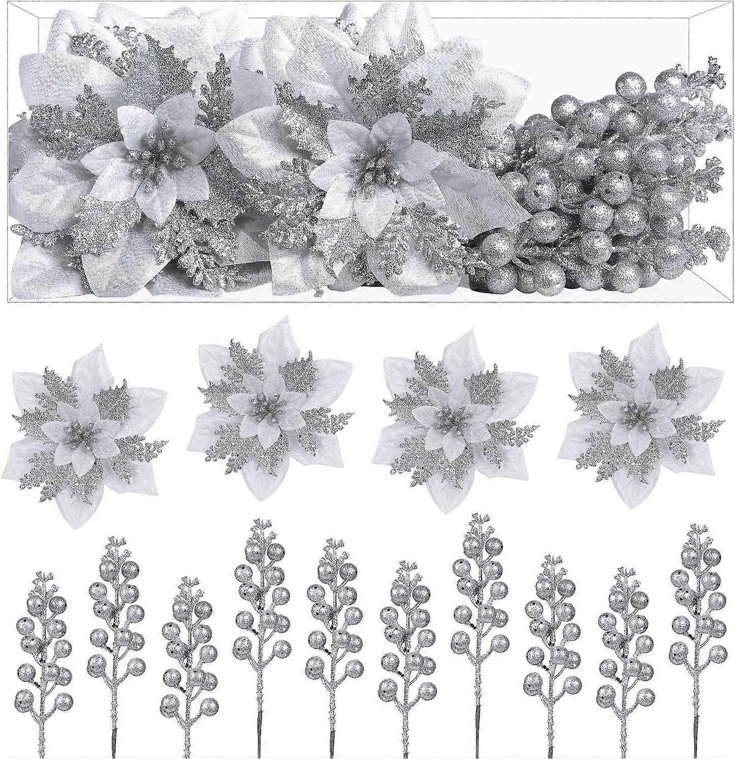24 Pcs Christmas Tree Picks: 12 Poinsettias + 12 Holly Berry Stems, compatible with Xmas Wreath & Garland, Gold