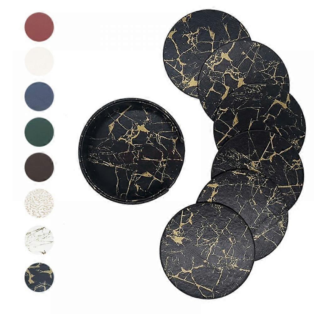 Product Pecification: Material: Pu Leather,PVC Diameter: 10cm/ 4in Package Weight: 0.5 lb Package Included: 6 x Leather Coasters, 1 x Leather holder Product Description: Beautiful, insulate and effectively catch condensation from cold drinks, protecting your desktop, countertops, or other surfaces from stains or damage. You can place your beer glass, coffee cup, tea cup, cold drink on these coasters. Double-sided PU leather material, round, simple, classic, solid design, stylish and elegant appearance, with a cool leather holder, suitable for almost all types of cups. These wonderful drinks coasters can protects your beloved dining table, kitchen countertops from damage and appropriate stains by hot water, coffee and tea. Suits for all families, hotels, restaurants and bars or give them as a Housewarming or holiday gift to a friend of loved one. Each coaster holder comes with a sturdy, tasteful holder, keeps coasters neatly stored when not in use. The PU surface quickly absorbs condensation and any liquid helps prevent furniture and tabletops from stains or water rings. Can also be used for Hot mugs, glasses, and bowls. Unlike silicone coasters which tend to stick to your drink container. These wonderful drinks coasters can protect your beloved dining table, kitchen countertops from damage. This cool coaster set is great for your home, kitchen, living room, man cave, bar, end tables, or college dorm room.