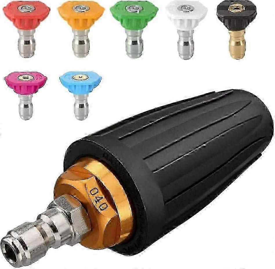 The tip of the rotating pressure washer creates a powerful rotating jet that increases both the intensity and the cleaning area of the nozzle. . The pressure washer's rotating nozzle has a 1 or 4 inch disconnect connection for more efficient cleaning. Suitable for most brands of gun or pressure washer. . The high-pressure cleaner spray nozzle cleans up to 40 percent faster than conventional nozzles. Ideal for cleaning dirty brick, concrete, vinyl and other large amounts of dirty or heavily soiled areas. . The high-pressure cleaner with turbo nozzle is known for hot and cold water in the high-pressure cleaner. The maximum water temperature can reach 100 degrees Celsius (212 degrees Fahrenheit). The maximum pressure is up to 4000 PSI. . Contains 7 pressure washer nozzles with different jet patterns. (Red 0 Degrees, Yellow 15 Degrees, Green 25 Degrees, White 40 Degrees, Black 65 Degrees, Pink Soap Mode, Blue Gutter) delivers a jet that reaches farther than traditional spray nozzles. . Note: Due to the light and screen setting difference, the item's color may be slightly different from the pictures. Please allow slight dimension difference due to different manual measurement.