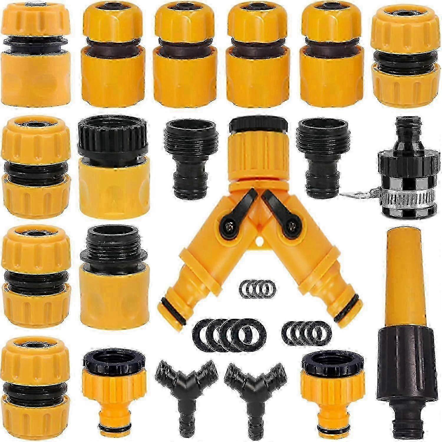 Hose Connector Garden Hose Fitting SetIncludes: 1 Nozzle, 4 Hose Repair Connector, 4 Hose Quick Connector, 1 Water Stop Connector, 2 Y Hose Splitter, 2 Hose Tap Connector 1 or 2 Inch And 3 or 4 Inch Size 2- In-1.2 Pack 3 or 4 Inch Male Thread Adapter (OD 26mm), Connector Male And Female Adapters, 2 Way Hose Connector, 1 Universal Faucet Connector, etc. Super Complete Hose ConnectorsVarious types of hose connectors can be used to connect garden hoses, faucets, pressure washers and maintenance of water pipes, etc. We have everything you need. Universal Compatibility and ApplicationThe hose connector is made of good quality ABS impact resistant plastic, strong and durable material will prolong the service life.Suitable to standard connectors. It can be used in many scenarios. Such as garden watering, green plant irrigation, outdoor car washing, exterior decoration cleaning, pet bath, etc. Universal SizeIt is suitable for the pipe of general market standard DN15 (outside diameter 16mm) and most general standard outside 1 or 2 inch and 3 or 4 inch threaded faucets. It is tool-less and can be quickly installed in seconds. Pipe fitting set The hose connector is made of durable ABS plastic. The specially designed groove allows you to easily load and unload during use. Widely used in gardening irrigation, balcony cleaning, car washing, watering flowers, trees and vegetables. Key benefits include: Kit for all hoses. (EXPANDABLE HOSE NOT INCLUDED) Connector easily adapts to outside faucet and converts it to standard quick connect system Y-connector helps split a water stream into two different directions using female hose end connectors Note: Due to the light and screen setting difference, the item's color may be slightly different from the pictures. Please allow slight dimension difference due to different manual measurement.