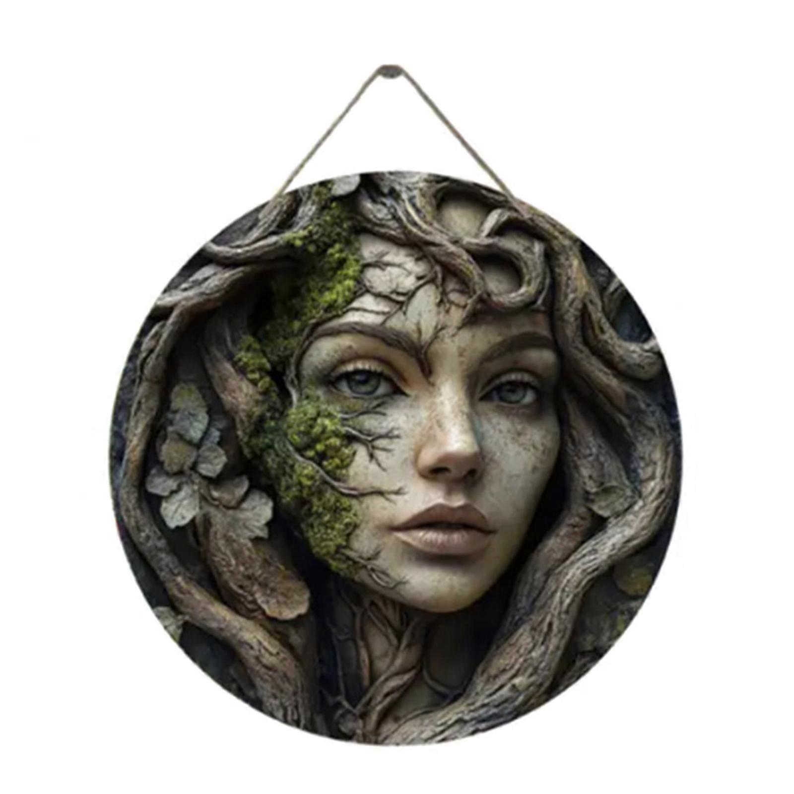Artistic Wooden Wall Hanging Sign Mysterious Tree Goddess Pattern Round Plaque for Home Office Front Door Decoration Multicolor