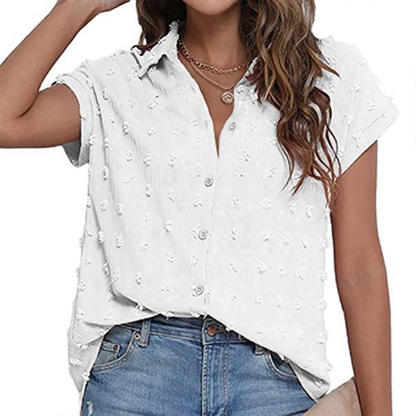 Women's Loose Fit Plain Blouse Collared V Neck 3D Dots Shirt Short Sleeve Button Down Tunics Top for Summer Casual Wear White XL