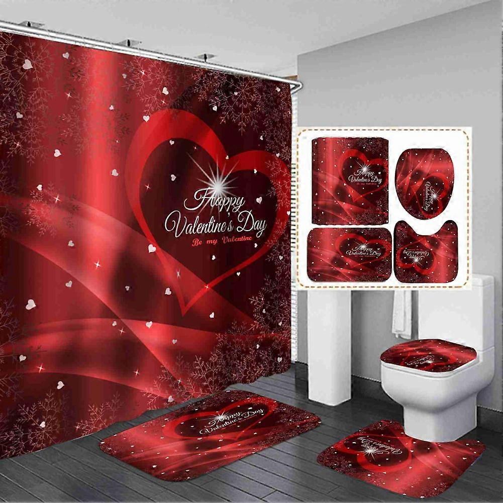 4PCS Valentines Day Love Shower Curtain Set with Non-Slip Rugs, Toilet Lid Cover and Bath Mat, Bathroom Shower Decor for Valentine Decoration