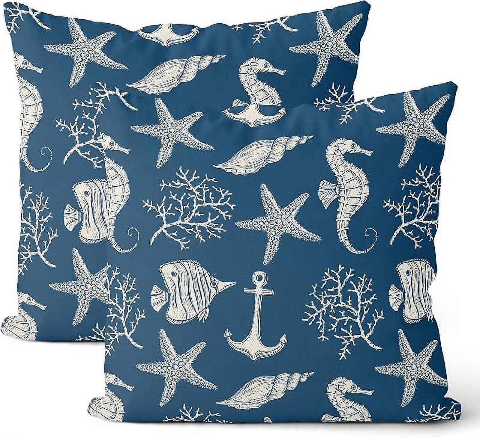 Coastal Pillow Covers 18x18 Set of 2, Blue Ocean Themed Beach Fish Seashell Design, Nautical Coral Starfish Cushion Cases for Sofa, Outdoor, Summer