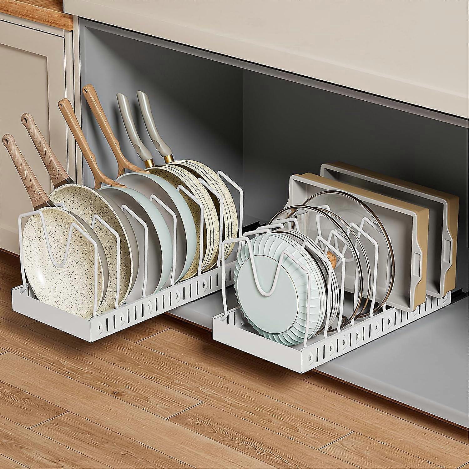 Product Description: No more crawling or playing detective in your deep cabinets. Our pull out pot and pan organizer makes it a breeze to find and store your pots and pans. Just slide the tray out to easily access everything, saving you time and hassle in the kitchen, eliminating the frustration of digging through cluttered cabinets [ EASY SLIDE-OUT DESIGN ] No more crawling or playing detective in your deep cabinets. Our pull out pot and pan organizer makes it a breeze to find and store your pots and pans. Just slide the tray out to easily access everything, saving you time and hassle in the kitchen, eliminating the frustration of digging through cluttered cabinets [ SPACE MAXIMIZATION FOR ANY KITCHEN ] Whether you're dealing with narrow pantry shelves, RV cabinets, or apartment kitchens. This pot and pan organizer is designed to utilize every inch of space efficiently, helping you discover new storage areas in 16 inches and deeper cabinets. Say goodbye to wasted space and hello to newfound storage [ VERSATILE AND ADJUSTABLE DIVIDERS ] With 8 adjustable dividers per set, 2 sets total, this cabinet organizer isn't just for pots and pans. lt can accommodate everything from 6-12 inch lids and pans to cutting boards, baking sheets, and more. And when you remove the dividers, it transforms into a slide-out cabinet organizer. Ideal for small kitchens and apartments, it’s a must-have for anyone looking for adaptable storage solutions [ NO-DRILL, HASSLE-FREE INSTALLATION ] Don't worry about installation! No-drill design makes set-up a breeze - no professional skills required. Just follow the simple guide to get organized in minutes. lf you need to permanently fix the pan organizer inside the cabinet, we also offer screws for punching holes. This flexible installation means less stress and more time enjoying your organized kitchen [ DURABLE, EASY-TO-CLEAM DESIGN ] The pot and pan organizer is built from high-quality materials, ensuring durability and a long-lasting design. Each pull-out cabinet organizer has a weight capacity of 55 lbs. Unlike other products with open base, our base is a tray that only needs to be wiped down during cleaning, preventing dirt from collecting and leaving your cabinets spotless. This design offers more durability, requires less maintenance, and creates a cleaner kitchen environment