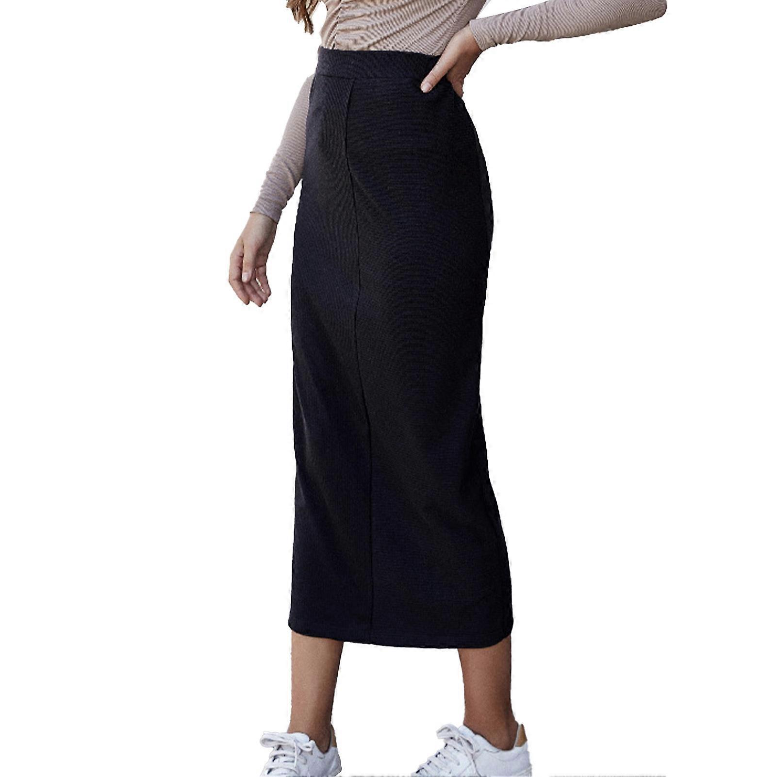 High Waist Bodycon Skirt Slim Fit Stretchy Pencil Autumn Midi Black Simple Skirt for Office