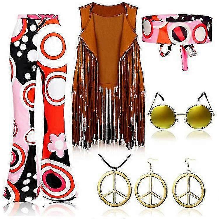 Specifications Gender: Women's, Girls' Types: Headband, Vest, Outfits, Pants, Cosplay Costume Jewelry Type: Necklace / Earrings Characters: Disco, Hippie Material: Polyester, Faux Suede Style: Hippie, 1960s, Retro Vintage, 1970s Design: Tassel Fringe Sleeve Length: Sleeveless Clothing Waist (cm): S:74;M:80;L:86;XL:92;XXL:98;3XL:102 Shoulder Width (cm): S:36;M:37;L:38;XL:39;XXL:40;3XL:41 Sleeve Length (cm): S:57;M:58;L:59;XL:60;XXL:61;3XL:62 Holiday: Masquerade, Carnival, Halloween Age Group: Adults' Occasion: Masquerade, Carnival Season: All Seasons What's in the box: Sunglasses, More Accessories, Pants, Vest
