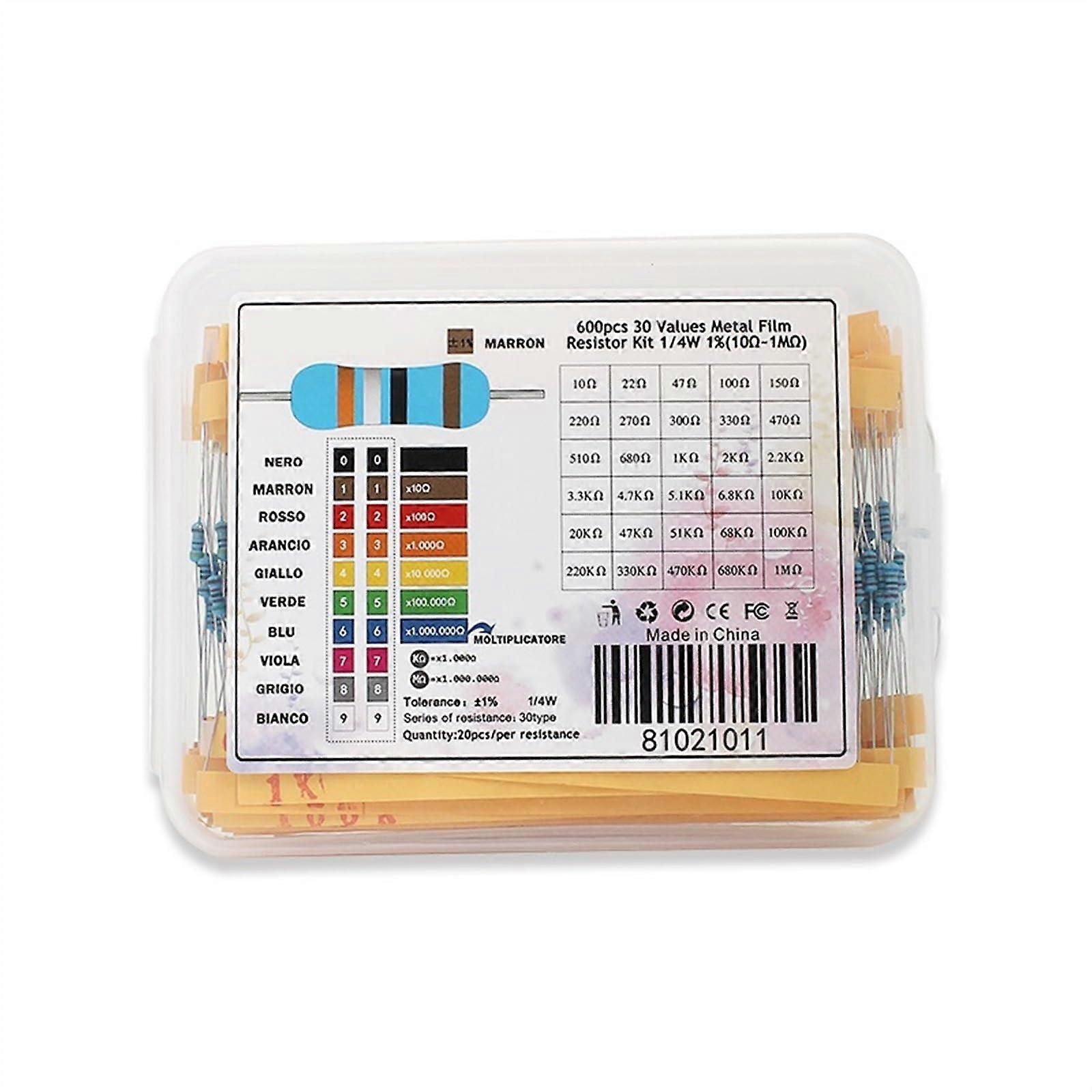 Metal Film Resistors 600 Pcs, 1% Tolerance, 0.25W ThroughHole, 30 Values 20 Pcs Each, 10 Ohm To 1M Ohm, DIY Kit