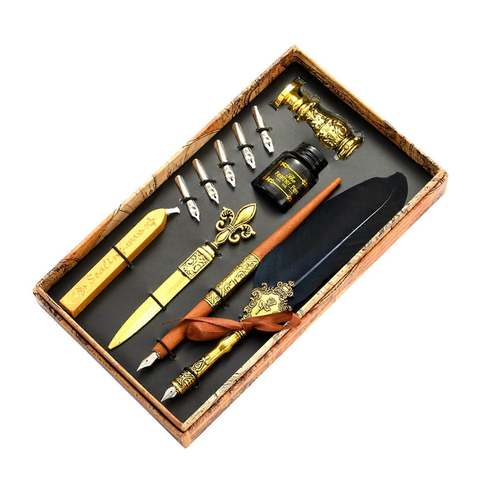 Quill Pen Calligraphy Set With Feather Dip Pen, Wood Dip Pen, 17 Nibs, Wax Seal Stamp & Holder, Black Ink, Navy Blue