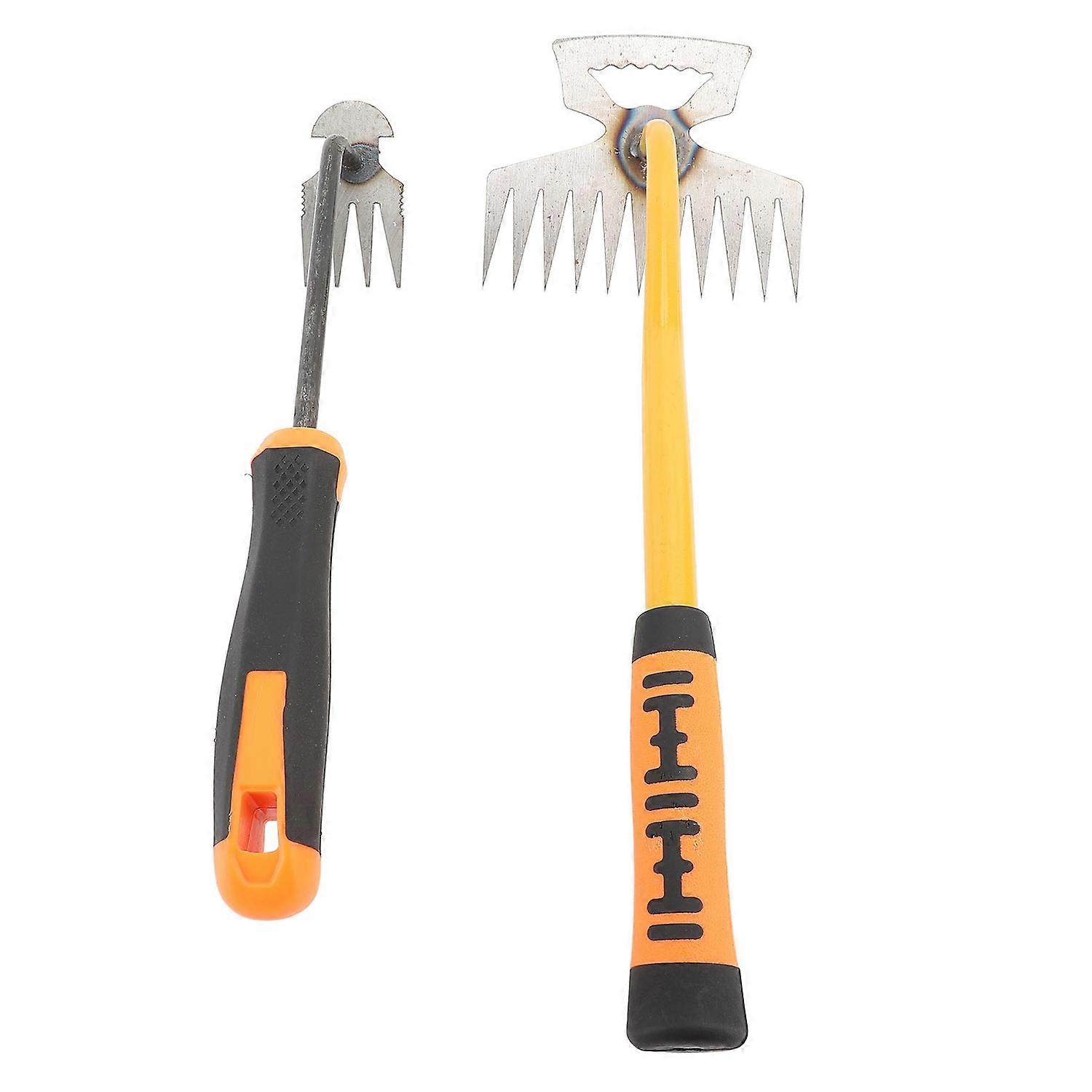Feature: 1. Small Garden Rake: A must have hand tool for every gardener. These hand rakes are great soil tillers with 4 and 11 teeth and is perfect for cultivating, turning, and loosening soil in preparation for planting flowers and vegetables, and for weeding. Includes durable and ergonomic handle. 2. Sturdy Teeth: Premium stainless steel tines make smooth work of soil and mulch while cultivataor also has the manueverability to work around smaller stems and delicate plants. Will last longer and is less likely to warp than other cultivators. 3. Ergonomic Handle: Ergonomic grip for comfort and control makes digging an cultivating hard ground a breeze. Rubber grip is designed to alleviate pressure on the palm and fingers and reduce hand and wrist fatigue that is common when digging in harder ground. 4. Say Goodbye to Weeds: With this multifunctional manual weeding machine, you can easily remove various weeds and carry out various gardening planting, excavation, and cuttings. It is very suitable for prying and clearing thistles, waistcoats, chickpeas and other common garden weeds. As a garden helper, your garden looks beautiful. 5. Easy to Carry: Our rake takes up less space in your garage than traditional bulky wooden handle rake. Perfect for on the go transport and outdoor camping activities, use garden rake to clean up anywhere. Specification: Item Type: Small Garden Rake Material: Rubber Handle, 201 Stainless Steel Weight: Approx. 494.00g / 17.43oz 11 Teeth Garden Rake Size: Approx. 38x13x8cm / 14.96x5.12x3.15in 4 Teeth Garden Rake Size: Approx. 33x4cm / 12.99x1.57in . Package List: 1 x 11 Teeth Garden Rake 1 x 4 Teeth Garden Rake