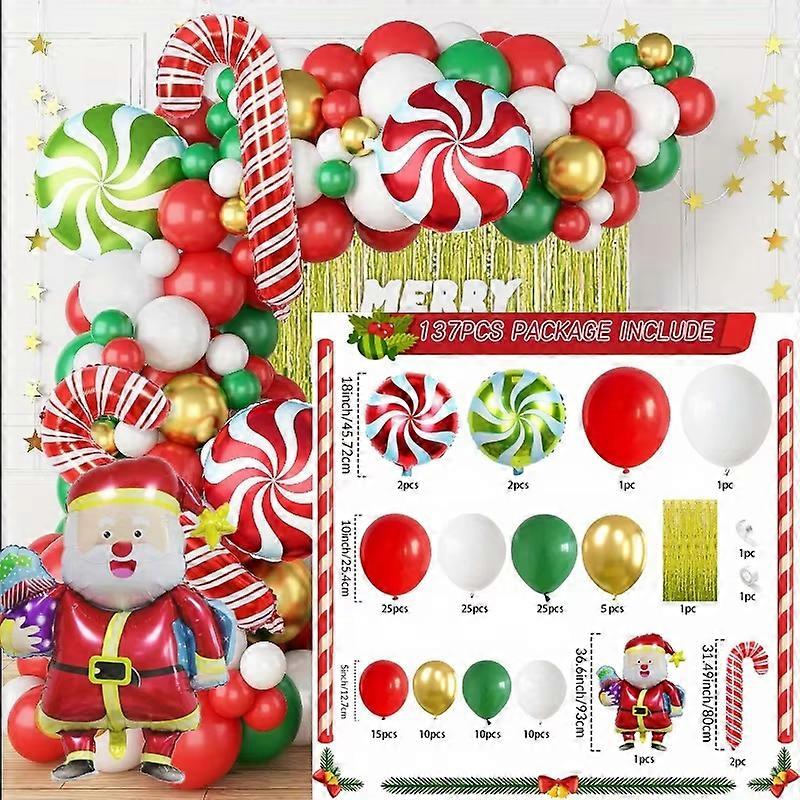 Specifications<br>High-concerned chemical:None<br>Occasion:Wedding & Engagement,Grand Event,Birthday Party,April Fool's Day,Chinese New Year,Thanksgiving,Party,Christmas,Valentine's Day,Wedding,Easter,New Year,Graduation,anniversary<br>Shape Style:Round<br>Origin:Mainland China<br>135 Pieces, Christmas Themed Wreath Set, Santa Claus Cane Candy Balloons, Suitable For Christmas Party Decoration, New Year Party Decoration, Family Gathering Indoor And Outdoor Decoration<br>No any experience required! The complete package can make an impressively large decorations in a short amount of time. Ribbons, glue dots, and balloon arch strips are all included in the package. 1. Don't overfill the balloon especially in hot weather. (just fill it to 80% is fine) 2. Thread the balloons alternately through the holes on both sides and add more with glue dots 3. Inflate as shown Premium Quality Won't Let You Dow<br>Let these fantastic colourful balloons be the highlight of your celebrations and add joy and colour to your special occasion. Shop now and let our balloons help you create un forgettable memories!
