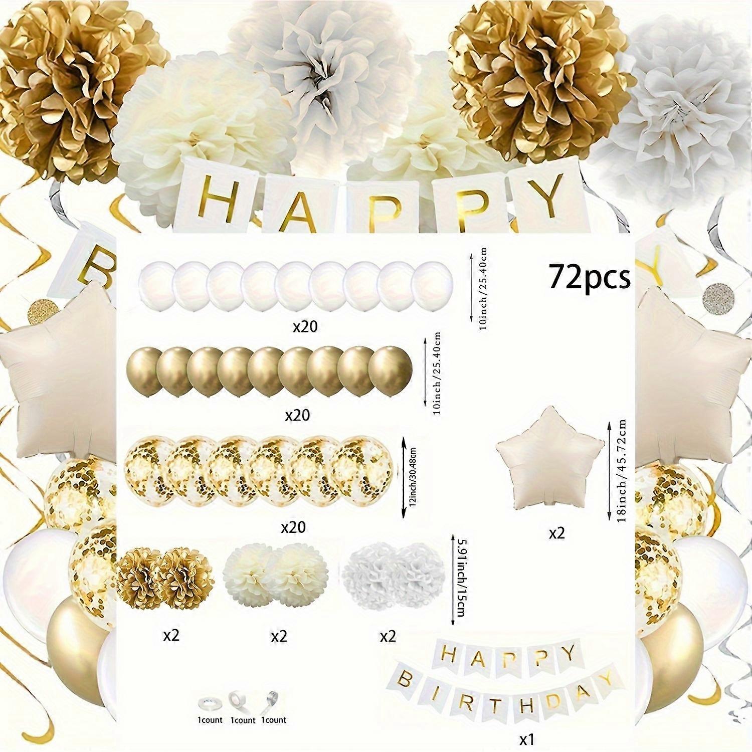 72pcs White and Gold Birthday Balloon Set with Happy Birthday Banner and Paper Flowers Suitable for Birthday Backdrop Decoration