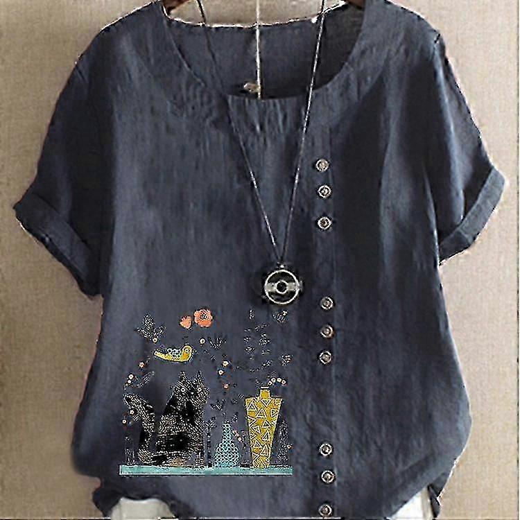 Women's Fashion Summer Round Neck Short Sleeve T-shirt Casual Cotton Linen Graphic Shirt Leisure Loose Flower Cat Prined Blouse Tops P