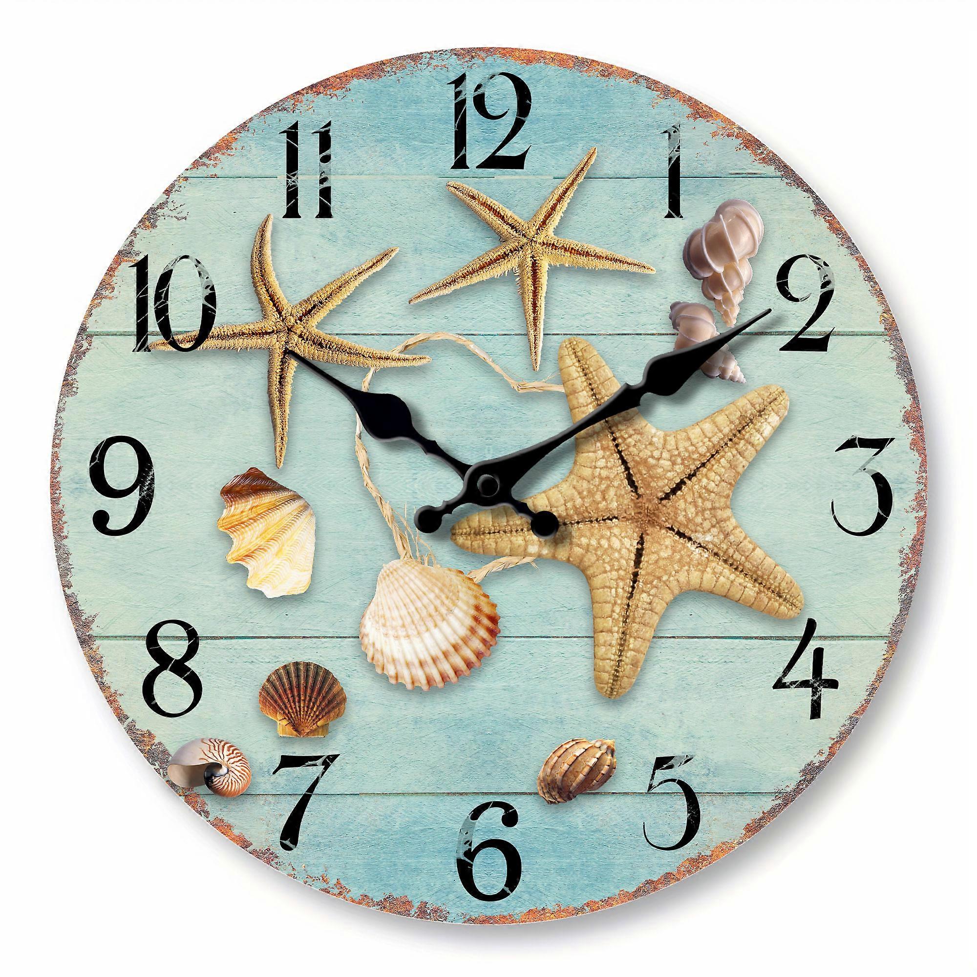 1pc Tropical Summer Beach wooden wall clock, retro blue wood plank background with starfish and conch shell design wall clock
