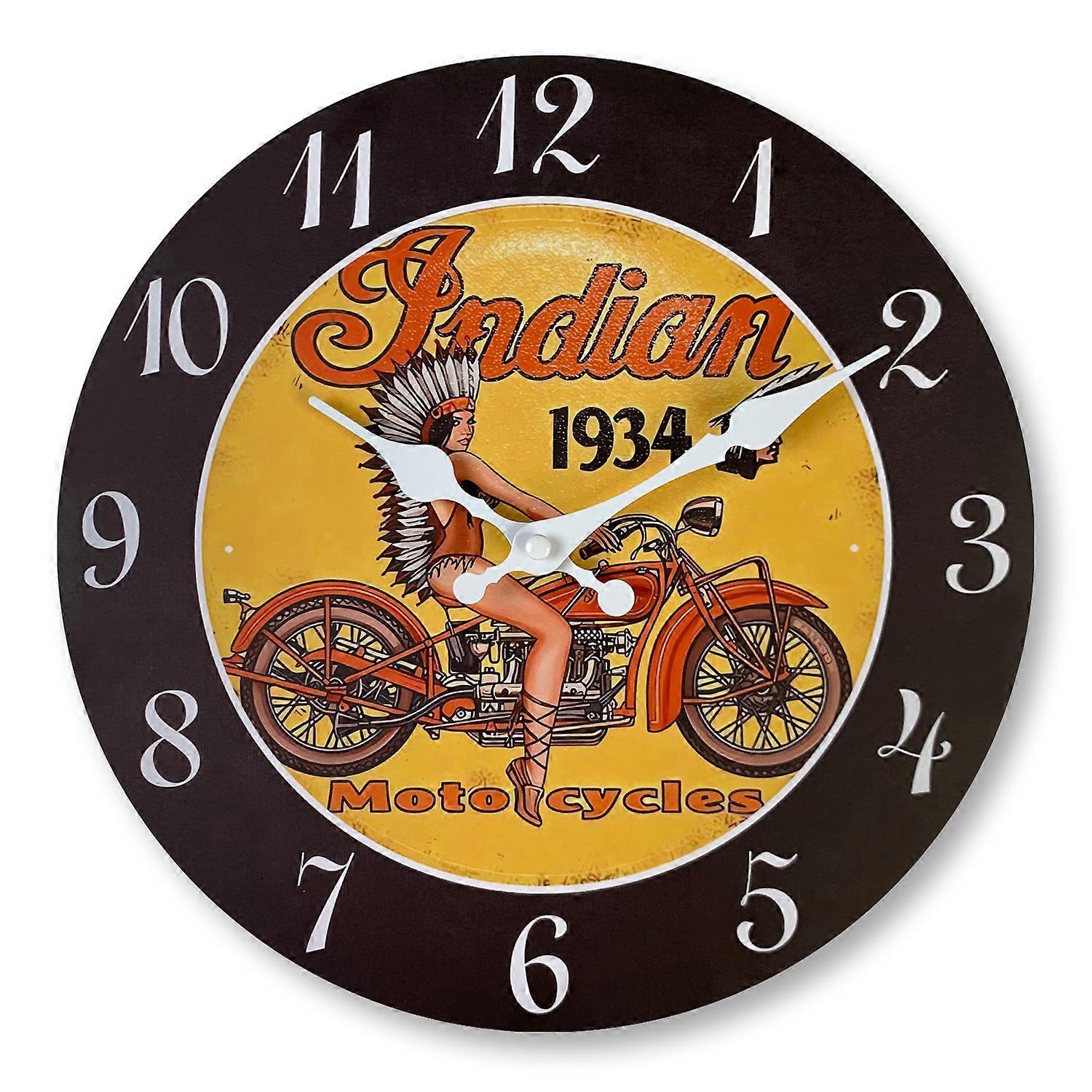 1pc vintage wooden wall clock, Indian Motorcycle and Indian Girl design wall clock, silent clock, garage wall decoration gift