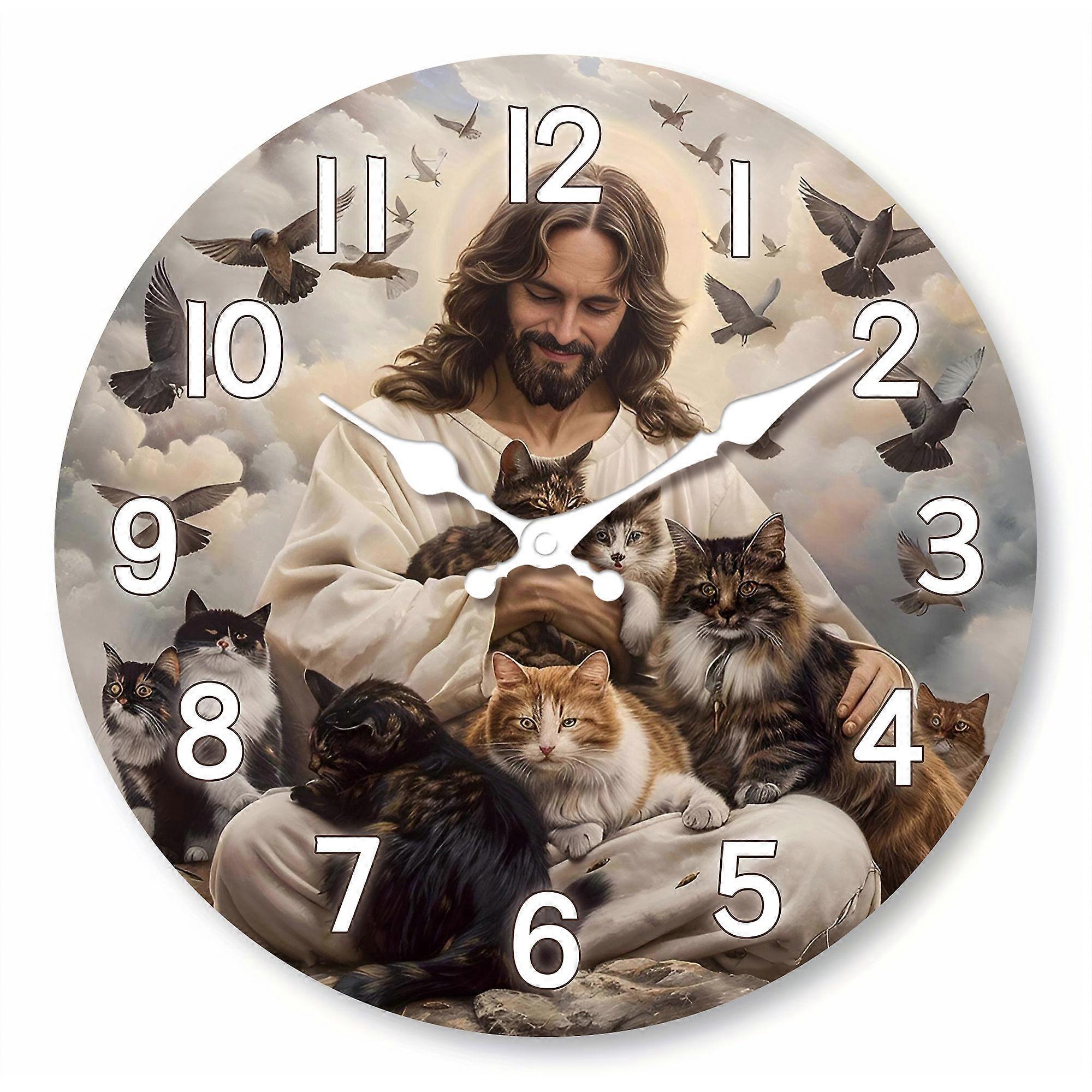 1pc Religious theme "Jesus Saves the Cat" Wooden wall clock - silent non-ticking, living room bedroom, home decoration clock