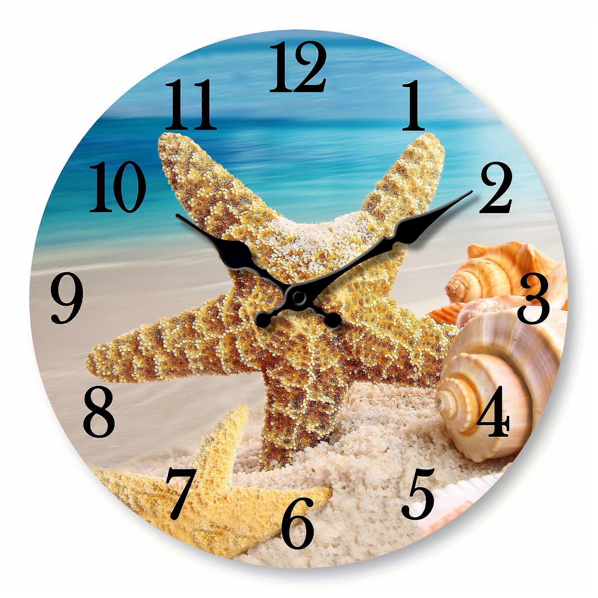 1pc wooden wall clock, blue sea, beach, round wall clock with starfish and conch design, silent clock, for living room bedroom,