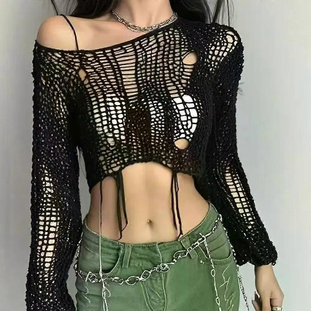Sexy White Slash Neck Grunge Knitted Women s Sweater Hole Ripped Pullover Crop Top Harajuku Hollow Out Fashion Summer Jumpers