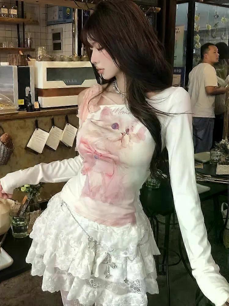Y2k Cat Print White Off shoulder Long sleeve T shirt Women Front Pink Lace Bow Tied Basic Tops Lady Slim fit Korean Chic Tees