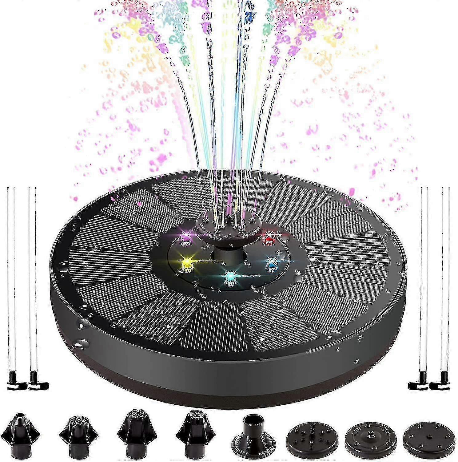 Features: 3W Solar Fountain Pump with Colorful LED Lights: Equipped with 6 colorful LED lights, these lights will light up at night (about 7 or 8 PM) automatically. RGB color auto-cycle setting makes your night more beautiful. The lights will not work if no energy. A full solar charge supports 4hrs lighting. Anti-Drift Design:Do you worry about the solar bird bath fountains swing around the birdbath and make part of the spray to land outside of the birdbath onto the ground and empting the birdbath rather quickly, so you have to keep refilling Dont worry at all <br> Gigilli solar fountain is equipped with 4 anti-collision plastic tubes, It can fix the fountain in the middle of the birdbath,You never have to worry about running out of water <br> 7 Different Nozzles: Gigilli solar water fountain comes with 7 nozzles, It can meet your different needs for water styles. It is easy to install in few seconds without tools required. Perfect for bird bath, small pond, pool, fish tank, garden decoration. Safety Protection and Long-Lasting: This solar fountain pump for bird bath comes with water-shortage protection and filtration box. Take protection when the shortage of water. Filtration box better for blocking dirt, dust, leaves to extends service life. Made of PET laminated solar panel ensure long-lasting use in harsh environments. Perfect for bird baths, small pond, pool, fish tank, garden decoration, and water circulation for oxygen. 900mAh Battery: Gigilli 3W birdbath fountain solar power with 900mAh battery backup can effectively store power to work at night with LED. Just place it in the water and it will work automatically in 3s once exposed to sufficient sunlight, up to 23.6 inch jet height on sunny days, about 11 inch on cloudy days. Note: During the day, the battery doesnt work and only stores energy, and it will work on fountains and lights at night.