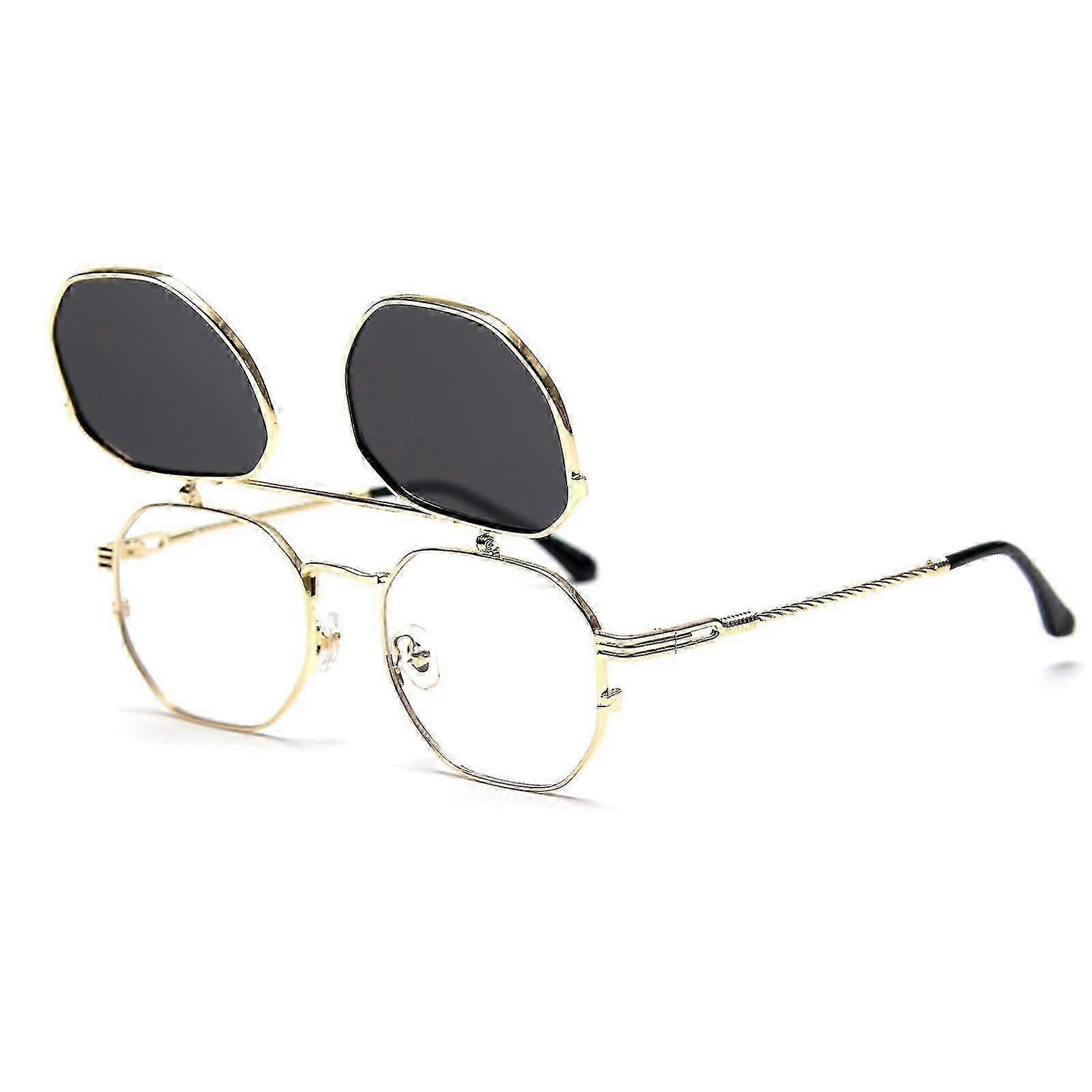 Double-layer flip-up lenses allow use as sunglasses or clear glasses. UV400 protection and polarized lens help reduce glare and eye fatigue. Crafted with sturdy metal frame and reinforced hinges for durability. Lens Width: 54mm | Height: 43mm | Temple Length: 143mm | Nose Bridge: 19mm. Suitable for daily wear, shopping, traveling, photos, parties and more. Trendy retro steampunk design adds style to any look. Colour: As shown. Package includes 1 flip up sunglasses. Care tips: Avoid paper towels/cloth to prevent scratches; do not use household detergents; keep away from seawater and high heat.