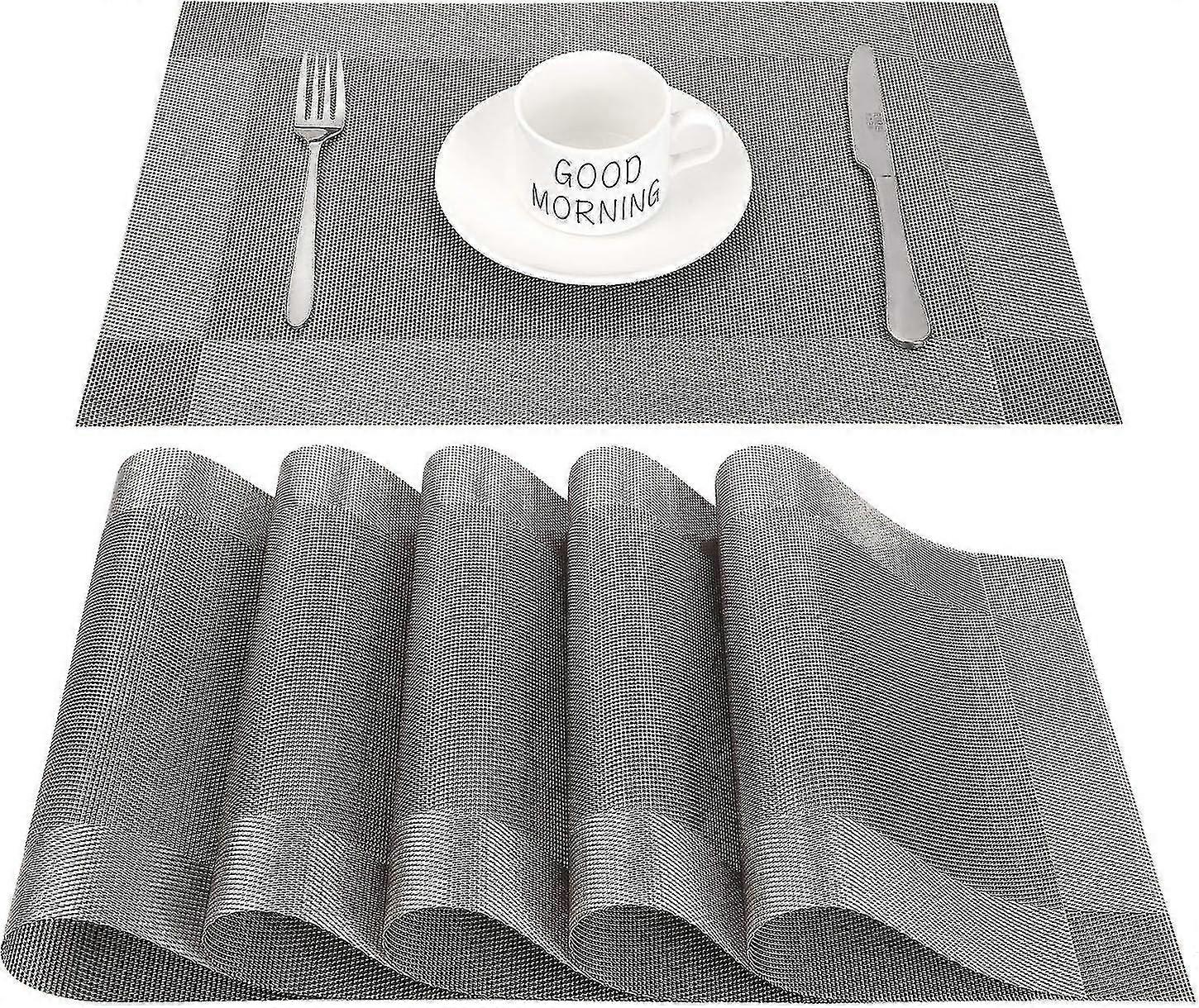 Placemats Set Of 6, Easy To Clean Non-slip Heat Resistant Washable Crossweave Woven Dining Table Mats 45cm X 30cm (Grey+Silver)