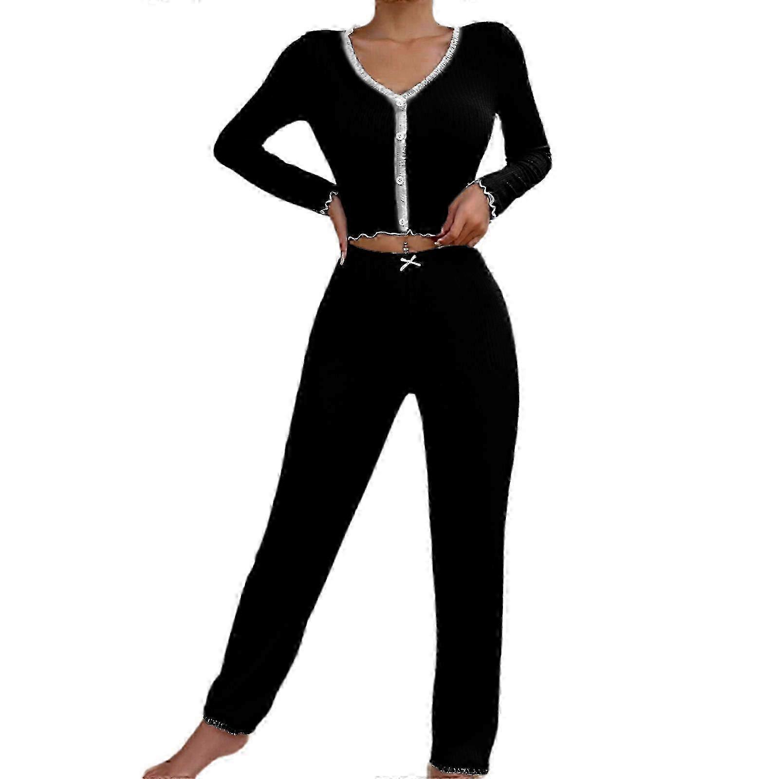 2 Piece V-Neck Long Sleeve Pajama Set with Ruffle Lace Trim & Button Front for Women - Crop Top and Ribbed Slim Pants in Red Beans XL Size