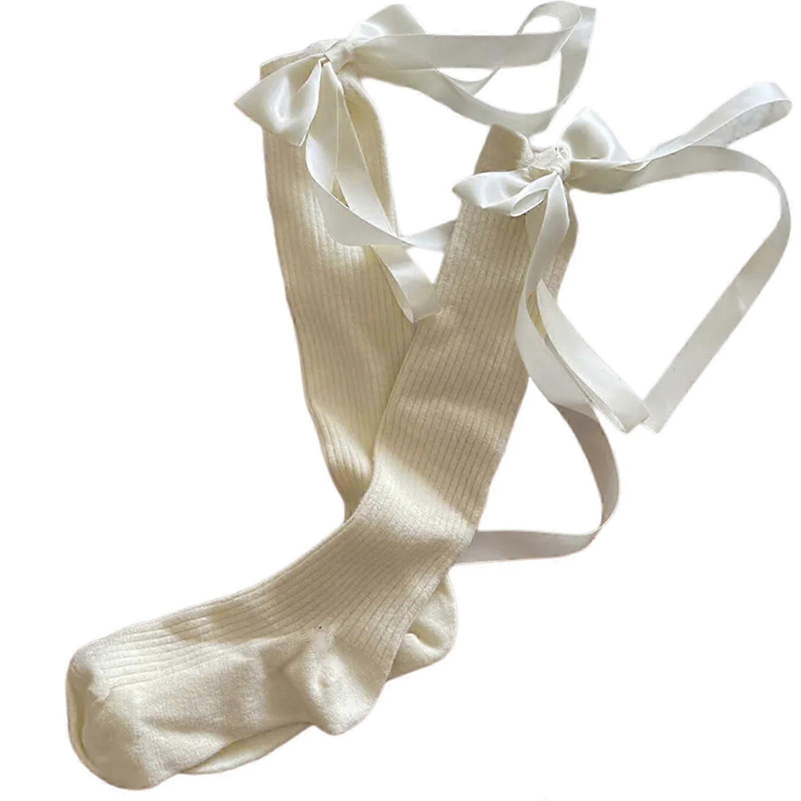 Elegant Satins Ribbon Bows Knee-Length Boot Socks for Women Students - Soft Warm Wool Ribbed Long Tube Stockings