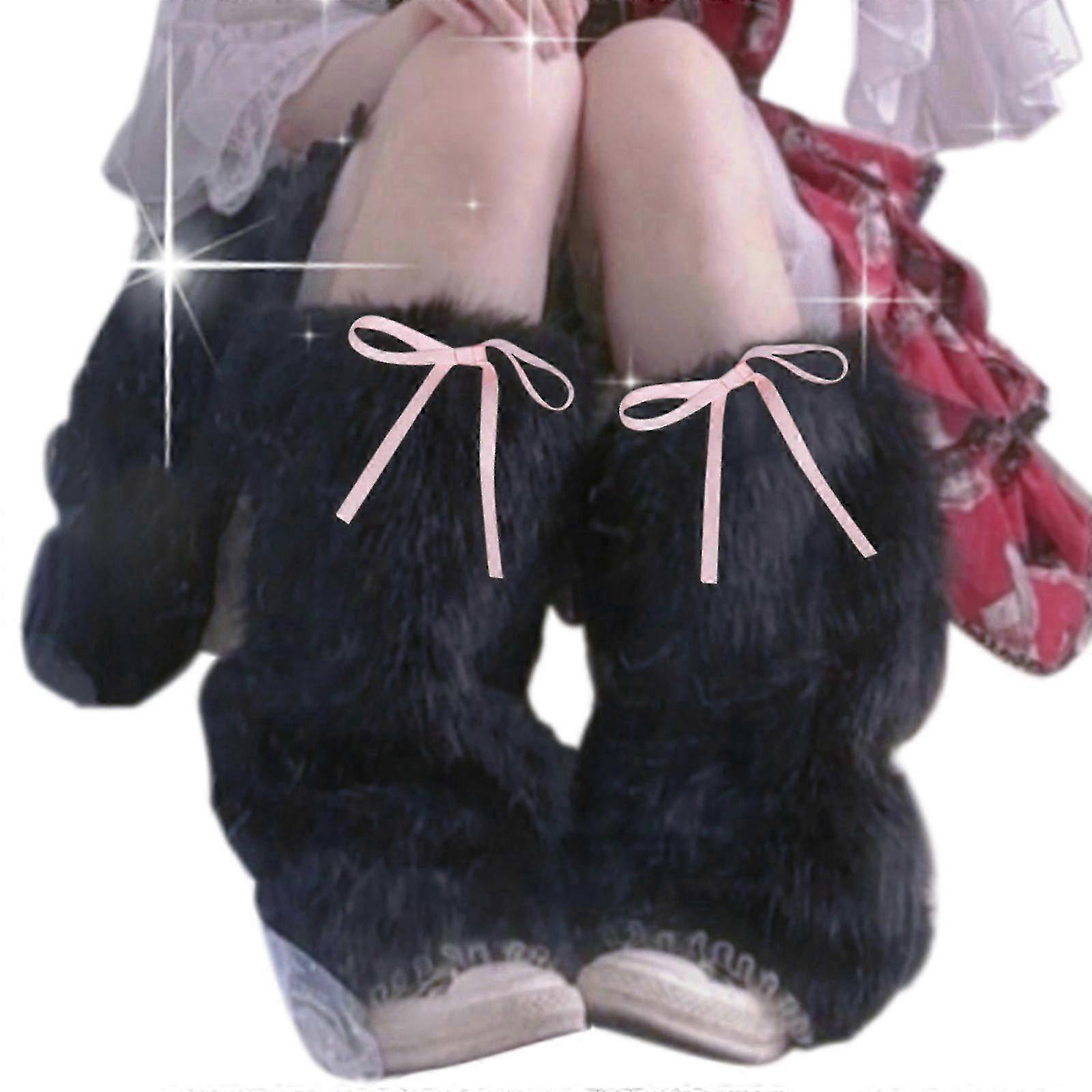 Fashionable Knee-Length Plush Leg Warmers with Ribbon Bowknot & Fuzzy Foot Covers for Women and Teens in Winter - White