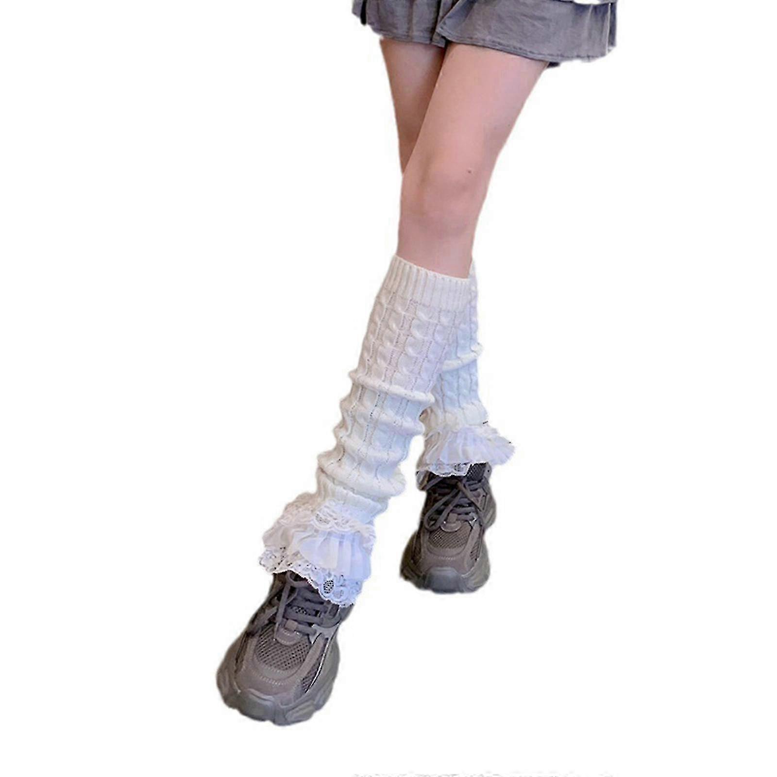 Twist Cable Knit Leg Warmers with Ruffled Lace Hem and Bowknot Detail for Women's Long Calf Socks