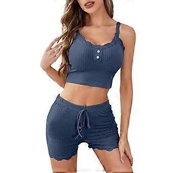 Womens 2-Piece Pajama Set: Purple Lace Trim Spaghetti Straps Cami Top with Button Closure & Drawstring Shorts Loungewear Outfit