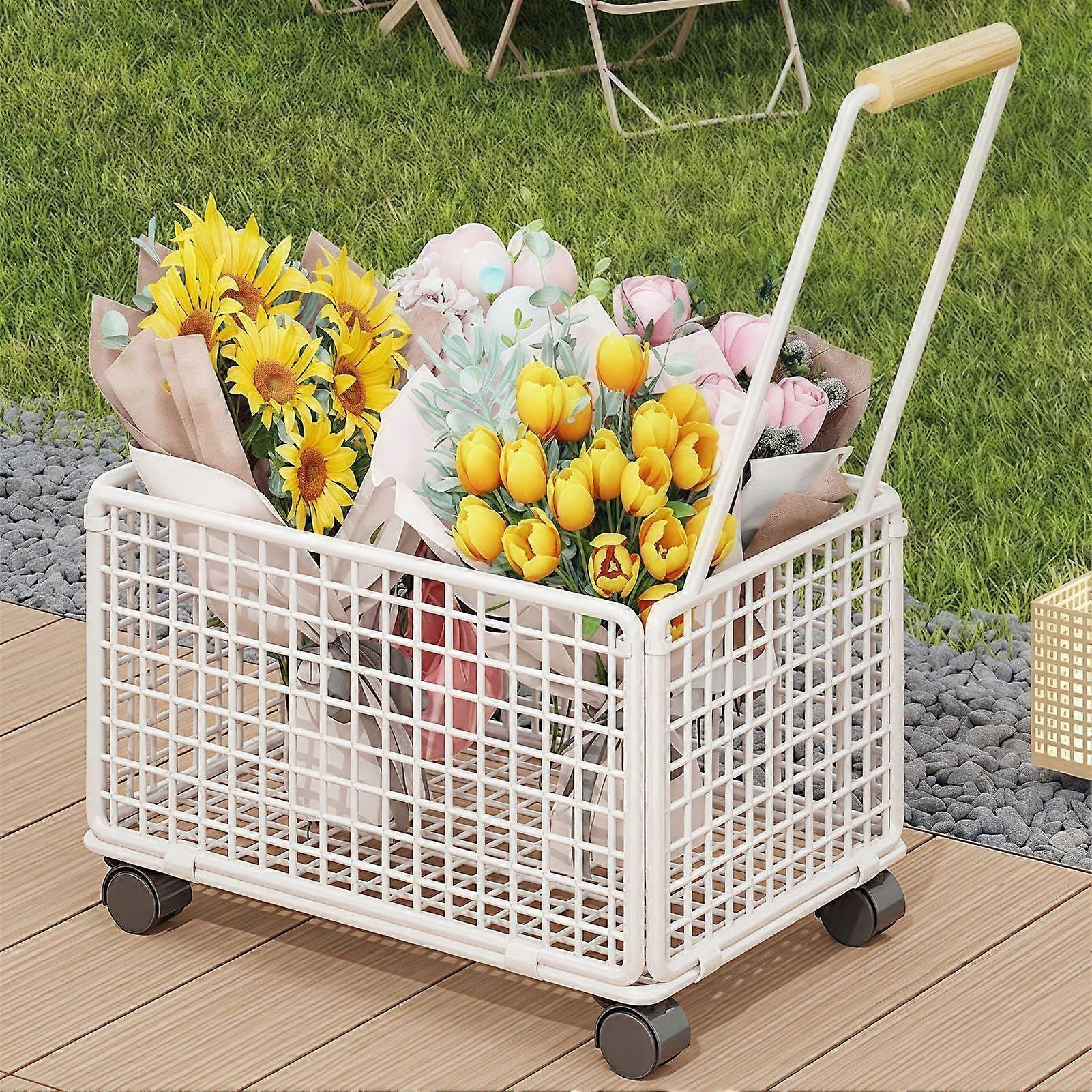 Rolling Laundry Basket With Wheels, Metal Cart Hamper, Iron Hampers For Dirty Clothes, Size S White, Extended Handle