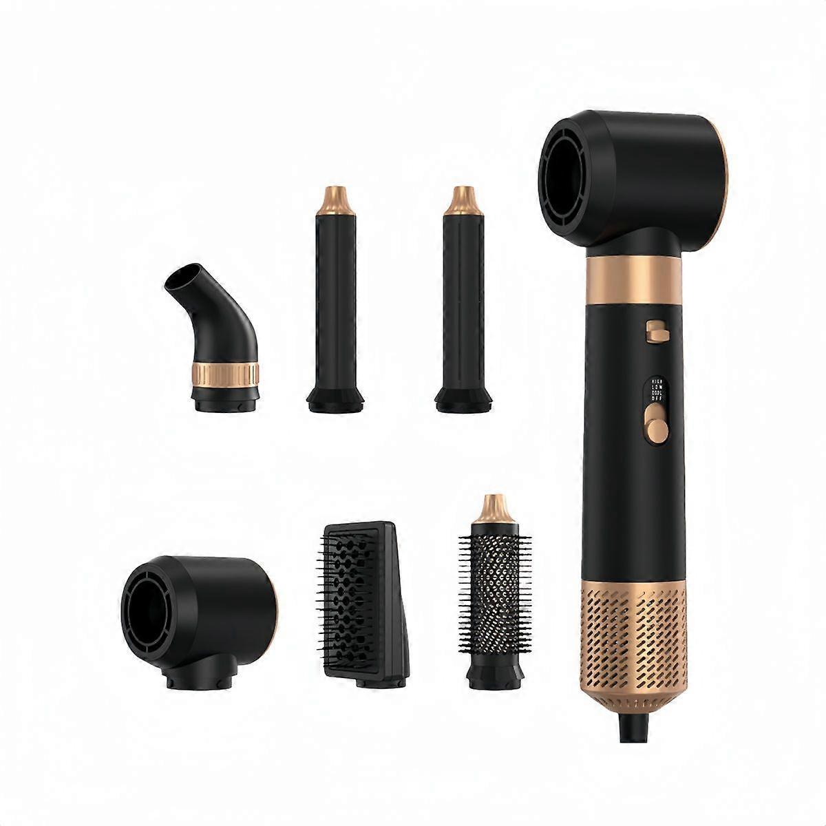A versatile all-in-one tool designed for effortless styling, drying, and volumizing with multiple interchangeable attachments. Versatility: Includes a main heating unit and several attachments: a pre-styling dryer nozzle, round volumizing brushes, curling barrels, and a flat smoothing brush. Aesthetics: Modern, sleek black body with luxurious gold/copper accents. Features: Designed to dry and style hair simultaneously, reducing heat exposure and styling time. Ideal for: Achieving salon-quality blowouts, waves, and smooth styles at home.