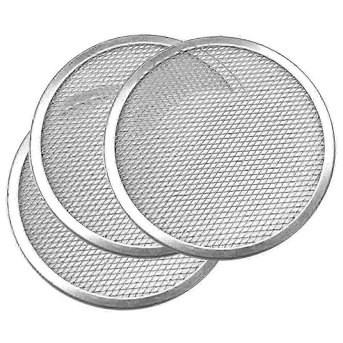 Usage Tips:Seamless Edge Design: Featuring a seamless edge, this 12-inch pizza screen prevents food from getting caught in any crevices, allowing for easy fer of pizzas to and from the oven. This thoughtful design promotes safe and hassle-free baking. Versatile Usage: Ideal not just for pizza, this rack is also great for baking other foods, including pastries, breads, and even vegetables. Its versatility makes it an essential tool for any kitchen or outdoor cooking area. Easy to Clean: The non-stick surface of these pizza screens ensures that food residue wipes away easily. Simply rinse or wash in the dishwasher for quick and efficient cleaning, so you can spend more time enjoying your delicious creations! Restaurant-Grade Quality: Crafted from metal materials, our 3Pcs Pizza Screen is designed for professional use, ensuring a reliable baking experience. Perfect for home kitchens and BBQs alike, this pizza rack delivers exceptional performance. Optimal Heat Distribution: The open mesh design of the pizza screen optimizes airflow, resulting in even heat distribution while cooking. Enjoy perfectly crispy crusts every time, whether you're baking in a conventional oven or on the grill. size:12 Inch Colour: Silver Material: Aluminum Package Contents: 3 x Pizza Pans Only the above package content, other products are not included. Note: Light reflection and different displays may cause the color of the item in the picture a little different from the real thing. The measurement allowed error is +/- 1-3cm.