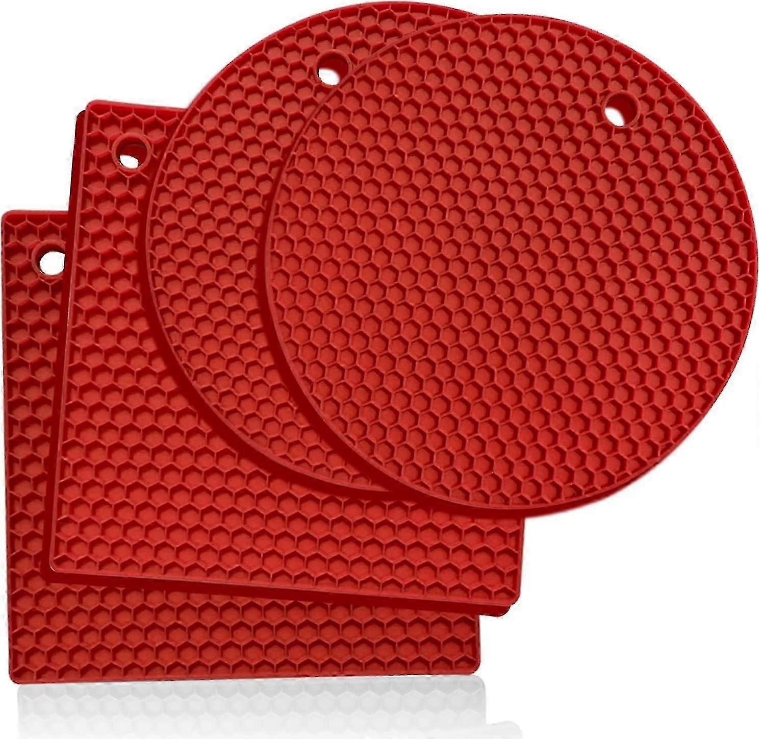 4-Piece Silicone Trivet Set - Round & Square Heat Resistant Mats for Hot Pots, Includes Can Opener, Tongs, Garlic Peeler & Coaster (Red) Edition 1107